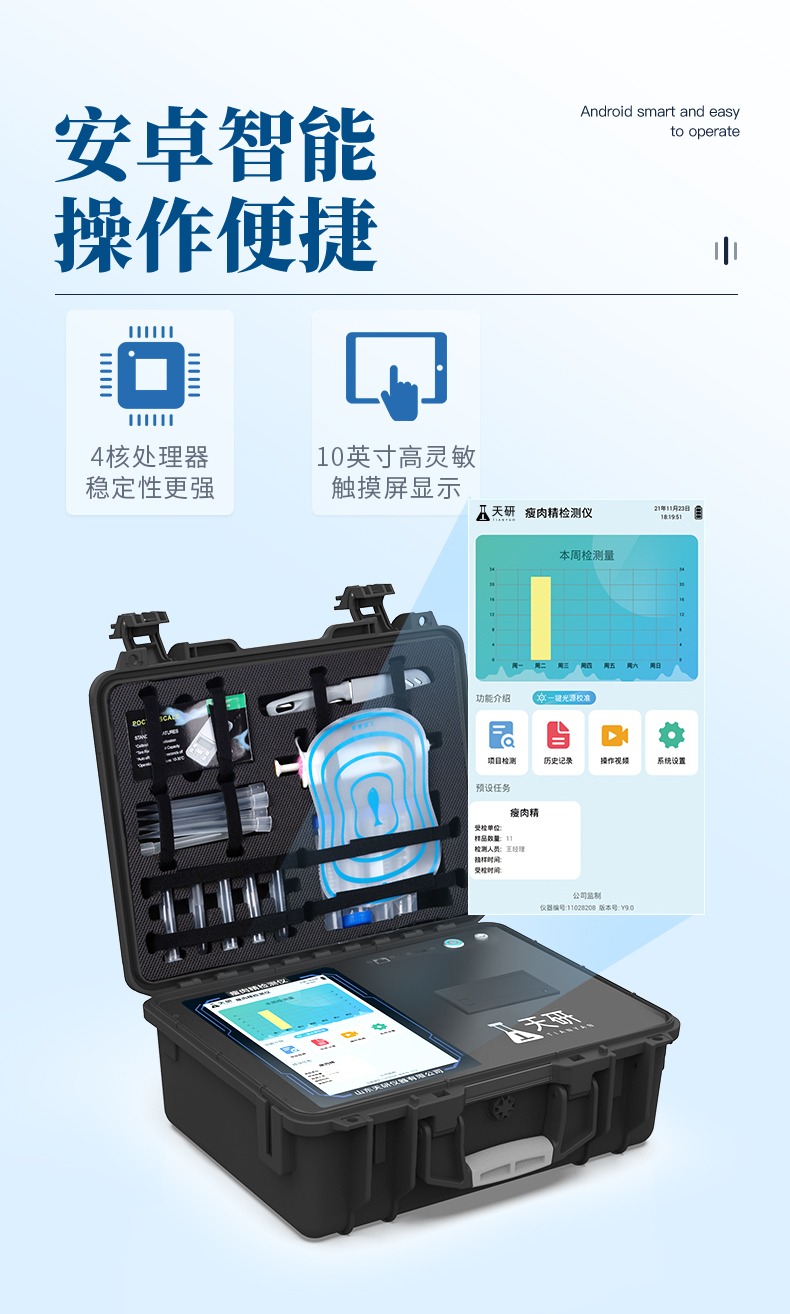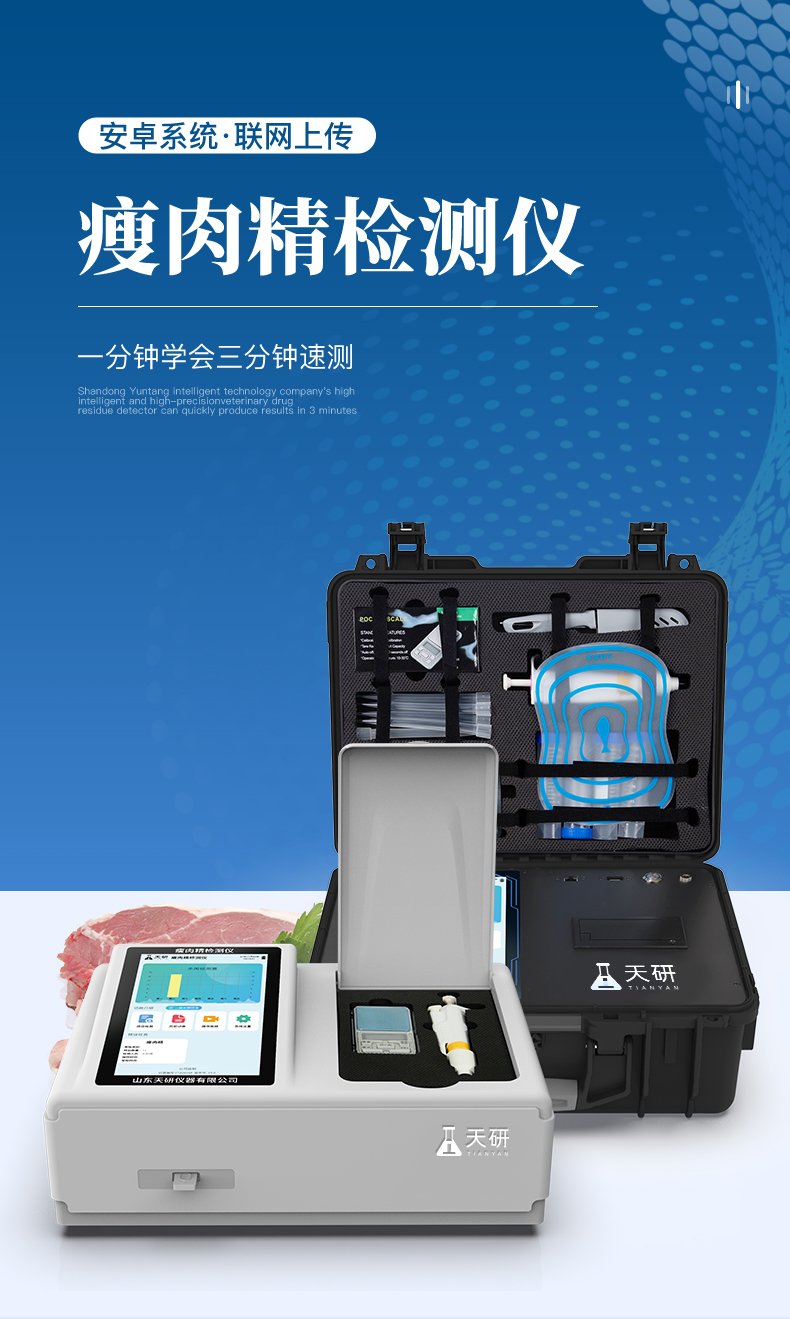 瘦肉精檢測(cè)儀可現(xiàn)場(chǎng)快速檢測(cè)鹽酸克倫特羅、萊克多巴胺、沙丁胺醇、己烯雌酚、喹乙醇等。儀器預(yù)留其他項(xiàng)目檢測(cè)程序和端口,根據(jù)日后需求可方便的自主增加檢測(cè)項(xiàng)目。日后可升級(jí)為檢測(cè)抗生素、獸藥殘留、動(dòng)物疫病、病害肉、的綜合類(lèi)型儀器