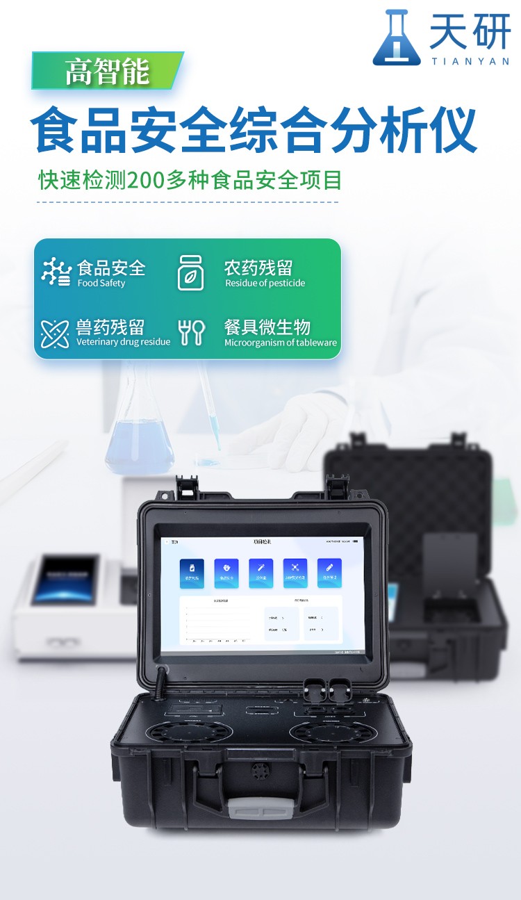 山東天研儀器有限公司生產(chǎn)的高智能食品安全檢測(cè)儀為集成化食品安全快速檢測(cè)分析設(shè)備,采用臺(tái)式一體化設(shè)計(jì),可快速檢測(cè)200多種食品安全項(xiàng)目,包含非食用化學(xué)物質(zhì)、濫用食品添加劑、農(nóng)藥殘留、獸藥殘留、重金屬、病害肉、營(yíng)養(yǎng)強(qiáng)化劑、抗生素類殘留、激素類殘留、真菌毒素類殘留、化學(xué)類殘留等項(xiàng)目的定性定量檢測(cè)。目前廣泛應(yīng)用于市場(chǎng)監(jiān)管局、檢測(cè)中心、衛(wèi)生監(jiān)督部門、農(nóng)業(yè)部門、院校及各單位食堂、食品肉產(chǎn)品深加工企業(yè)、商超市場(chǎng)、司法部門、餐飲機(jī)構(gòu)、養(yǎng)殖場(chǎng)、屠宰場(chǎng)、檢驗(yàn)檢疫部門等單位。
