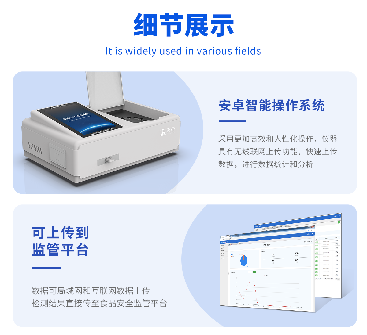 | 儀器采用臺式一體化系統(tǒng)檢測技術(shù),將分光光度模塊、膠體金檢測模塊、新型農(nóng)殘檢測模塊、數(shù)字化管理模塊、無線通訊模塊高度集成于一體,支持檢測200種食品安全檢測項目,同時預(yù)留升級檢測方法。 | 儀器檢測模塊標(biāo)準(zhǔn)化、智能化,可隨意自由組合。檢測箱體內(nèi)置多個標(biāo)準(zhǔn)檢測單元,檢測模塊可以調(diào)整配置。 | 儀器采用全新安卓智能系統(tǒng),主控芯片采用 ARM Cortex-A7,RK3288/4核處理器,10.1寸高清液晶觸摸豎屏,更加**的UI交互界面,運(yùn)轉(zhuǎn)快捷;儀器配備無線通信模塊: 4G(APN)通訊模塊、Wifi模塊,藍(lán)牙傳輸,同時具有雙USB接口以及RJ45接口能以多種方式實現(xiàn)數(shù)據(jù)保存和數(shù)據(jù)傳輸功能。 | 創(chuàng)新檢測模式: | ★檢測通道:≥12通道;采用精密旋轉(zhuǎn)比色池設(shè)計,使用同芯片同光源校準(zhǔn)精度,解決不同光源之間的誤差值。1-12通道間誤差0.1%。(**號:ZL202022821055.2) | ★儀器具有自動識別比色皿檢測功能,即:將樣品比色皿放入儀器后,點擊樣品檢測,儀器自動識別比色皿進(jìn)行通道檢測。 | 進(jìn)口高精光源: | 高精度進(jìn)口四波長冷光源,通道配置 410、520、590、630nm 波長光源,一個光源芯片驅(qū)動一個光源,誤差極小,每臺設(shè)備單獨**校準(zhǔn)光源,**比對,同時參照四種不同波段光源全方位覆蓋市面上99%的農(nóng)殘食品項目檢測。 | 膠體金模塊檢測方式: | 采用COMS實時成像技術(shù),可采集多個畫面,支持3個金標(biāo)同時讀卡,通過不同顏色的灰度變化,一秒精準(zhǔn)得出結(jié)果。 | 智能化操作系統(tǒng): | 便捷操作系統(tǒng):設(shè)備檢測時可在同一檢測界面自動對應(yīng)相關(guān)檢測通道一次性選擇1-12個樣品名稱,無須退出界面,節(jié)省操作時間。 | 數(shù)據(jù)集成系統(tǒng):設(shè)備首頁自動統(tǒng)計檢測數(shù)據(jù)包含:周檢測數(shù)據(jù)、月檢測數(shù)據(jù),全部檢測總數(shù)量,均包含檢測總數(shù),合格數(shù),不合格數(shù),以及相關(guān)柱形分析圖,對各項檢測數(shù)據(jù)清晰掌握,無需電腦查詢,更加快捷直觀。 | 項目預(yù)設(shè)系統(tǒng):支持添加單個及多個相同或不相同的任務(wù)預(yù)設(shè),一鍵快速調(diào)取,每一個任務(wù)分別可以設(shè)置不同的樣品、批次、編號、來源、備注、抽樣信息、檢測信息、受檢信息、復(fù)核信息等更多信息。無縫鏈接平臺和APP實時查看下發(fā)任務(wù)。 | 數(shù)據(jù)監(jiān)管系統(tǒng):同步對接監(jiān)管平臺,數(shù)據(jù)可局域網(wǎng)和互聯(lián)網(wǎng)數(shù)據(jù)上傳,檢測結(jié)果可選擇直接傳至食品安全監(jiān)管平臺。集成OSS輸出存儲服務(wù)、區(qū)分設(shè)備定向管理應(yīng)用,進(jìn)行區(qū)域食品安全監(jiān)管及大數(shù)據(jù)分析處理與數(shù)據(jù)統(tǒng)計,檢測區(qū)域食品安全長短期動態(tài),達(dá)到食品安全問題預(yù)估、預(yù)警。 | 自定義打印系統(tǒng):內(nèi)置全新打印系統(tǒng),新創(chuàng)自定義打印方式,可按需靈活設(shè)置開啟或關(guān)閉:產(chǎn)品合格證(國家農(nóng)業(yè)部標(biāo)準(zhǔn)要求),二維碼,抽樣信息、檢測信息,受檢信息、復(fù)核信息、抽樣日期、檢測日期等信息的打印。 | 系統(tǒng)遠(yuǎn)程更新功能:可定向分客戶分儀器更新系統(tǒng),按照不同客戶后期實際需求添加項目,無需機(jī)器返廠,即可遠(yuǎn)程實時升級全新系統(tǒng),節(jié)省時間成本及避免運(yùn)輸造成設(shè)備損壞。 | 儀器主機(jī)采用一體化防水、抗壓、防撞擊、防腐蝕箱體設(shè)計,同時配備交直流供電,可連接車載電源,可選配大容量充電鋰電池,滿足現(xiàn)場野外檢測需求。 | 安全證書,放心保障:儀器具有中國計量科學(xué)研究院校準(zhǔn)證書,**認(rèn)證。 |