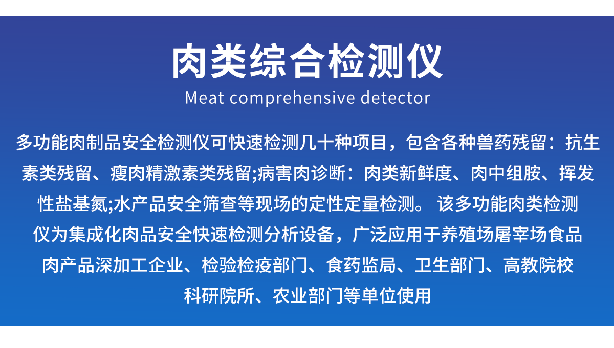 肉類綜合檢測儀可快速檢測幾十種項目,包含各種獸藥殘留:抗生素類殘留、瘦肉精激素類殘留;病害肉診斷:肉類新鮮度、肉中組胺、揮發(fā)性鹽基氮;水產(chǎn)品安全篩查等現(xiàn)場的定性定量檢測。