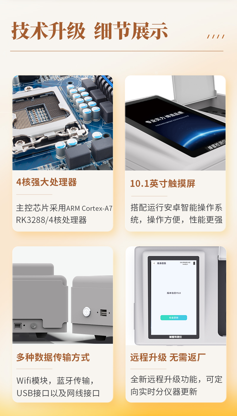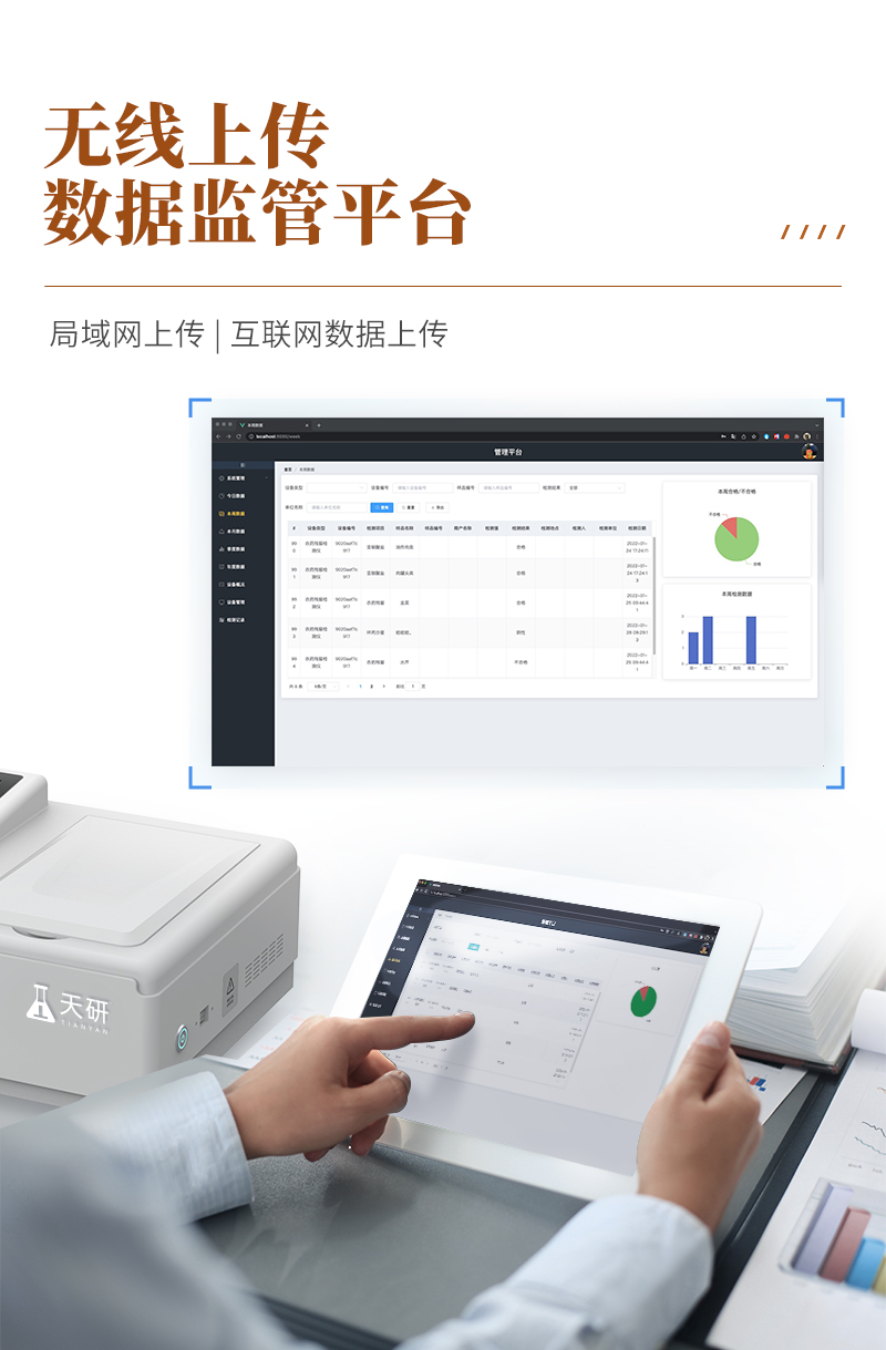 | 儀器采用手提一體化系統(tǒng)檢測(cè)技術(shù),將分光光度模塊、膠體金檢測(cè)模塊、新型農(nóng)殘檢測(cè)模塊、數(shù)字化管理模塊、無線通訊模塊高度集成于一體,支持檢測(cè)200種食品安全檢測(cè)項(xiàng)目,同時(shí)預(yù)留升級(jí)檢測(cè)方法。 | 儀器檢測(cè)模塊標(biāo)準(zhǔn)化、智能化,檢測(cè)項(xiàng)目可隨意自由組合。檢測(cè)箱體內(nèi)置多個(gè)標(biāo)準(zhǔn)檢測(cè)單元,檢測(cè)模塊可以調(diào)整配置。 | 顯示屏幕:儀器采用10.1英寸豎向液晶觸摸屏顯,搭配運(yùn)行安卓智能操作系統(tǒng),主控芯片采用ARM Cortex-A7,RK3288/4核處理器,主頻1.88Ghz,操作方便,性能更強(qiáng)。 | 檢測(cè)通道:≥12通道;采用精密旋轉(zhuǎn)比色池設(shè)計(jì),使用同芯片同光源校準(zhǔn)精度,解決不同光源之間的誤差值,更加準(zhǔn)確**。(1-12通道間誤差0.1%,**號(hào):ZL202022821055.2) | 儀器光源:高精度進(jìn)口四波長(zhǎng)冷光源,每個(gè)通道均配置 410、520、590、630nm 波長(zhǎng)光源,標(biāo)配**的光路切換裝置,**光路切換功能可實(shí)現(xiàn)64波長(zhǎng),并且所有檢測(cè)項(xiàng)目可實(shí)現(xiàn)所有通道同時(shí)檢測(cè)。 | 設(shè)備可一鍵校準(zhǔn),自動(dòng)保存校準(zhǔn)數(shù)據(jù),自動(dòng)對(duì)比校驗(yàn),得到精準(zhǔn)光源,采用Android SP存儲(chǔ)數(shù)據(jù),光源數(shù)據(jù)永不丟失,方便每一次使用。 | 通訊接口:配備無線通信模塊、4G(APN)通訊模塊、藍(lán)牙傳輸,同時(shí)具有雙USB接口以及RJ45網(wǎng)線接口,可以多方式實(shí)現(xiàn)數(shù)據(jù)保存及數(shù)據(jù)傳輸。 | 存儲(chǔ)方式:支持U盤存儲(chǔ),標(biāo)準(zhǔn)USB接口,免驅(qū)動(dòng)安裝。檢測(cè)結(jié)果存儲(chǔ)容量20萬條以上,可生成Excel表格進(jìn)行拷貝,并具有登錄保護(hù)功能。 | 智能化操作系統(tǒng):: ★操作系統(tǒng):儀器可在同一檢測(cè)界面自動(dòng)對(duì)應(yīng)相關(guān)檢測(cè)通道,一次性選擇1-12個(gè)樣品名稱,無需退出界面,節(jié)省操作時(shí)間。并可以對(duì)每個(gè)通道屬性和樣品信息單獨(dú)進(jìn)行編輯,例如送檢單位、人員,檢測(cè)人員等,打印時(shí)勾選打印顯示。 | ★數(shù)據(jù)集成系統(tǒng):設(shè)備首頁自動(dòng)匯總分析檢測(cè)數(shù)據(jù),包含:周檢測(cè)數(shù)據(jù)、月檢測(cè)數(shù)據(jù),全部檢測(cè)總數(shù)量,均包含檢測(cè)總數(shù),合格數(shù),不合格數(shù),以及相關(guān)柱形分析圖,各項(xiàng)檢測(cè)數(shù)據(jù)一目了然,無需電腦查詢,更加快捷直觀。 | ★數(shù)據(jù)庫系統(tǒng):十幾項(xiàng)數(shù)據(jù)庫分類管理儀器:包含項(xiàng)目類型、項(xiàng)目數(shù)據(jù)、檢測(cè)數(shù)據(jù)、歷史記錄、國(guó)標(biāo)信息、曲線信息、采樣信息、檢測(cè)信息、受檢信息、復(fù)核信息、圖表信息、光源校準(zhǔn)信息、打印樣式信息、樣品庫信息等等,數(shù)據(jù)庫之間互相協(xié)調(diào)聯(lián)動(dòng)保證數(shù)據(jù)的真實(shí)完整性。同時(shí)產(chǎn)品數(shù)據(jù)庫以及歷史檢測(cè)記錄支持一鍵檢索功能。 | ★限量規(guī)判系統(tǒng):具有限量查詢、添加物質(zhì)合規(guī)判定系統(tǒng)。檢測(cè)出結(jié)果后,系統(tǒng)自動(dòng)調(diào)用系統(tǒng)數(shù)據(jù)庫中相關(guān)國(guó)標(biāo)進(jìn)行比對(duì)判定,客觀顯示判定結(jié)果是否合格 | ★項(xiàng)目預(yù)設(shè)系統(tǒng):儀器具有任務(wù)預(yù)設(shè)模塊,一鍵提前預(yù)設(shè),給出方便快捷的新檢測(cè)方案,每一個(gè)任務(wù)分別可以設(shè)置不同的樣品、批次、編號(hào)、來源、備注、抽樣信息、檢測(cè)信息、受檢信息、復(fù)核信息等更多信息。樣品送檢時(shí)一鍵調(diào)取保存信息,并可多次調(diào)取,大大提高檢測(cè)效率。 | ★數(shù)據(jù)監(jiān)管系統(tǒng):同步對(duì)接監(jiān)管平臺(tái),數(shù)據(jù)可局域網(wǎng)和互聯(lián)網(wǎng)數(shù)據(jù)上傳,檢測(cè)結(jié)果可選擇直接傳至食品安全監(jiān)管平臺(tái)。進(jìn)行區(qū)域食品安全監(jiān)管及大數(shù)據(jù)分析處理與數(shù)據(jù)統(tǒng)計(jì),檢測(cè)區(qū)域食品安全長(zhǎng)短期動(dòng)態(tài),達(dá)到食品安全問題預(yù)估、預(yù)警。 | ★打印系統(tǒng):內(nèi)置全新打印機(jī),新創(chuàng)自定義打印方式,可按需靈活勾選控制:產(chǎn)品合格證(國(guó)家農(nóng)業(yè)部標(biāo)準(zhǔn)要求),二維碼,抽樣信息、檢測(cè)信息,受檢信息、復(fù)核信息、抽樣日期、檢測(cè)日期等信息的打印。 | 供電模式:儀器交直流兩用,直流12V供電,可連接車載電源,可配6ah大容量充電鋰電池,電量可實(shí)時(shí)顯示,方便戶外流動(dòng)測(cè)試。 | 膠體金檢測(cè)模塊:采用雙通道CMOS成像處理技術(shù)及膠體金免疫層析技術(shù),可同時(shí)讀取雙膠體金卡數(shù)據(jù),自動(dòng)采集、處理分析,將檢測(cè)結(jié)果顯示,并可根據(jù)參考限值自動(dòng)判斷檢測(cè)結(jié)果,可檢測(cè)常見的獸藥殘留、生物毒素、抗生素、違禁添加物等。 | ★探測(cè)技術(shù):CMOS成像探測(cè); | ★檢測(cè)通道:1個(gè)通道; | ★檢測(cè)方式:消線法和比色法; | ★顯示模式:陰性或陽性; | 曲線形式:軌道式掃描方式,顯示金標(b