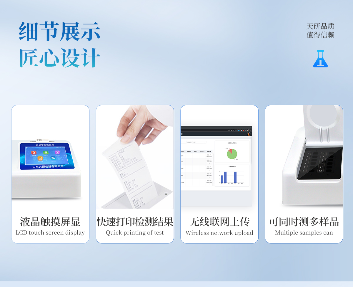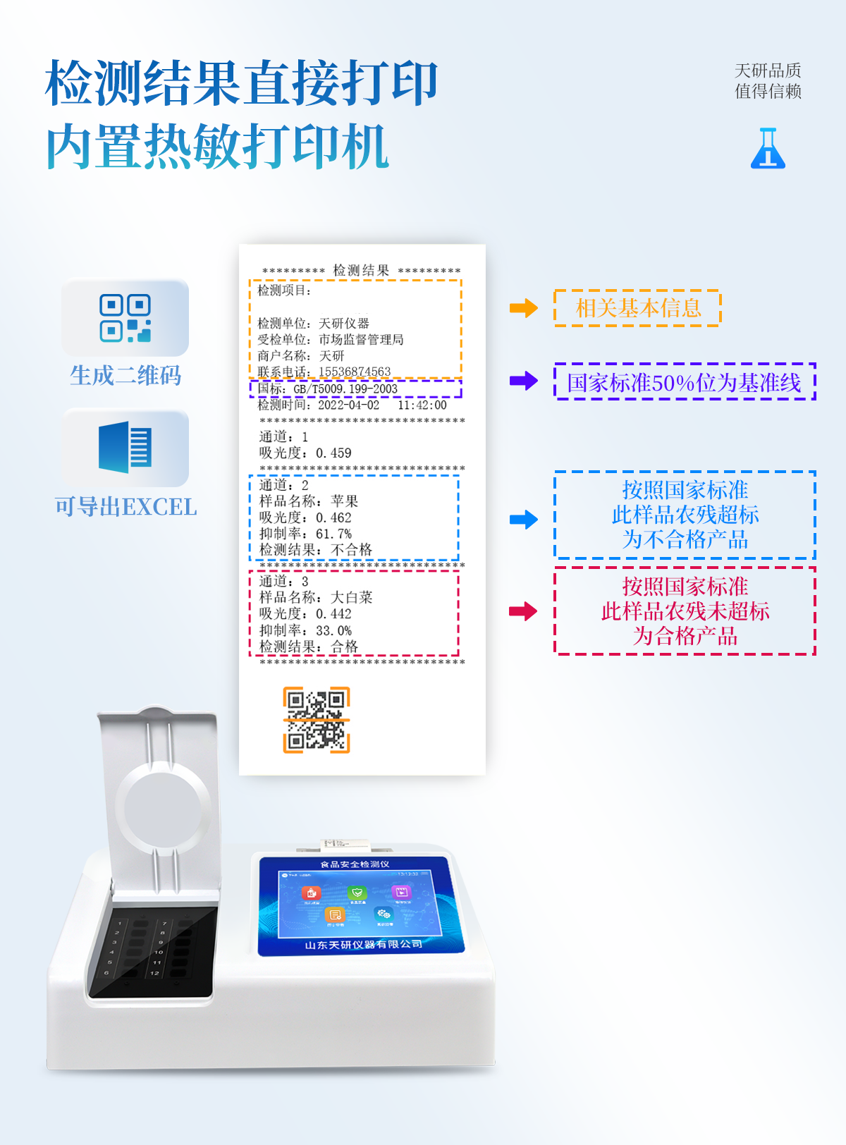 | 安卓智能操作系統(tǒng),采用更加**和人性化操作,儀器具有網線連接、wifi聯網上傳、GPRS無線遠傳功能,快速上傳數據。 | 智能化程度高,儀器具有自檢功能:具有開機自檢和調零功能,具有自動檢測重復性功能。 | 檢測通道:≥12個檢測通道,可以同時測試多個樣品,每個樣品由程序控制分別獨立工作,不會互相干擾。 | 顯示方式:≥8英寸液晶觸摸屏顯示,人性化中文操作界面,讀數直觀、簡單。 | 配備新一代嵌入式熱敏打印機,可選擇手動打印或者自動打印,檢測完成可自動打印檢測報告和二維碼。 | 光源采用進口超高亮發(fā)光二極管,高精度、穩(wěn)定性強、光源可控、可以關掉不使用的光源,功耗更低。 | 采用USB2.0接口設計,方便數據的存貯和移動,并可隨時與計算機直接相連,并且可用計算機控制儀器。實現數據查詢、瀏覽、分析、統(tǒng)計、打印等。 | 儀器帶有監(jiān)管平臺。數據可局域網和互聯網數據上傳,檢測結果直接傳至食品安全監(jiān)管平臺。進行區(qū)域食品安全監(jiān)管及大數據分析處理,檢測區(qū)域食品安全長短期動態(tài),達到食品安全問題預估、預警 | 一體化便攜式快檢設備,滿足現場及流動檢測使用需求,能夠在同一軟件下實現所有檢測項目的檢測,并可通過同一窗口直觀顯示檢測結果。 | 儀器具有多品類多種類樣品菜單庫,可靈活選擇檢測樣品,不同的檢測通道可同時檢測不同的樣品項目。也可在儀器上直接編輯錄入樣品名稱、檢測指標、送檢單位等信息并保存進樣品數據庫。 | 樣品處理簡單省力,整體操作快速、安全、便捷。 | 儀器具有自身保護功能,可設置用戶名及密碼,防止非工作人員操作等。 | 高靈敏度,高檢測精度,高重復性精度,掃描式高精度光學傳感器。 | 儀器具有重新校準、鎖定、恢復出廠設置功能。 | 支持U盤存儲。 結果判定線可修改,對照值標定值可保存,斷電不丟失數據。 |