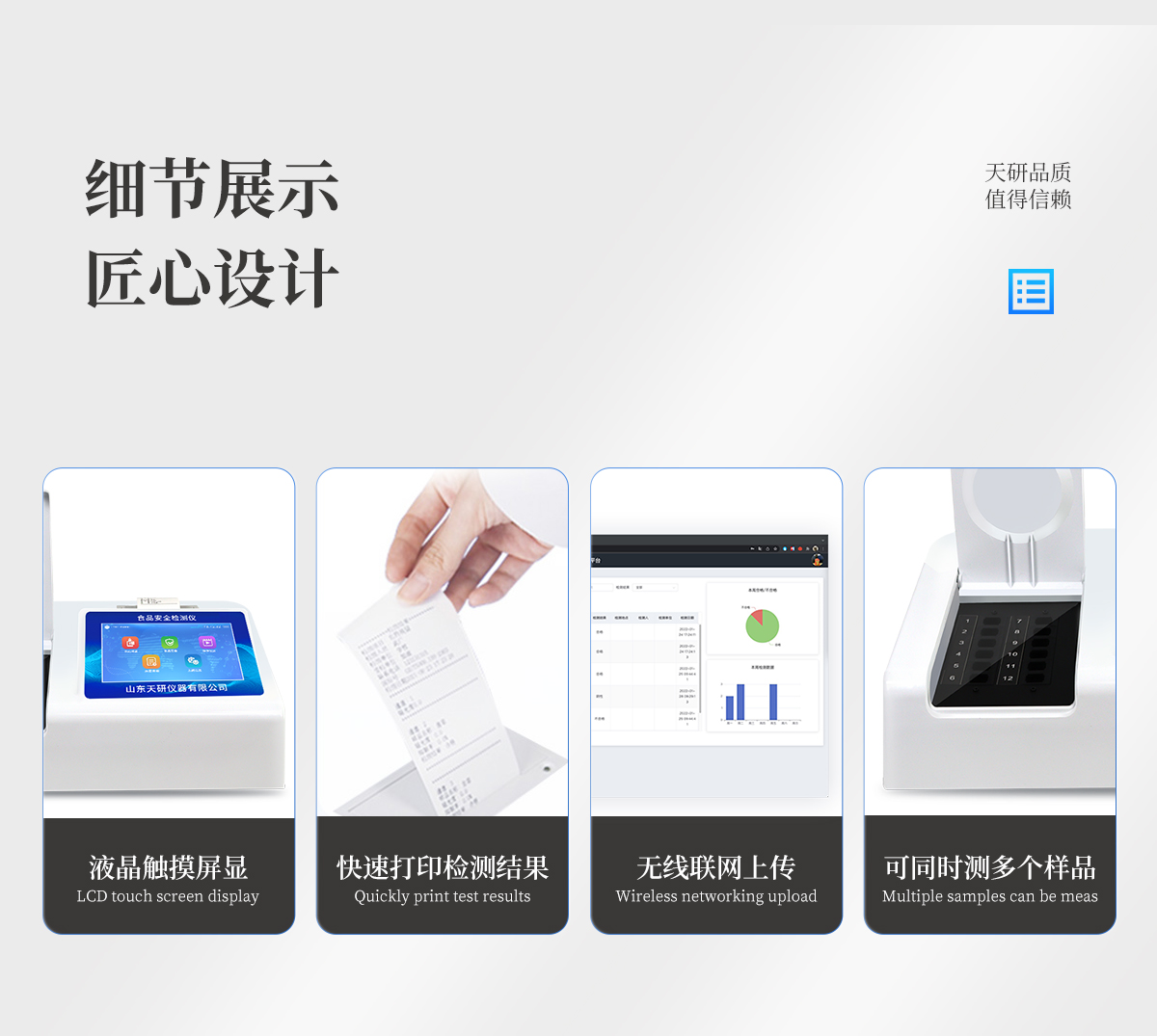 | 安卓智能操作系統(tǒng),采用更加**和人性化操作,儀器具有網(wǎng)線連接、wifi聯(lián)網(wǎng)上傳、GPRS無線遠(yuǎn)傳功能,快速上傳數(shù)據(jù)。 | 智能化程度高,儀器具有自檢功能:具有開機自檢和調(diào)零功能,具有自動檢測重復(fù)性功能。 | 檢測通道:≥12個檢測通道,可以同時測試多個樣品,每個樣品由程序控制分別獨立工作,不會互相干擾。 | 顯示方式:≥8英寸液晶觸摸屏顯示,人性化中文操作界面,讀數(shù)直觀、簡單。 | 配備新一代嵌入式熱敏打印機,可選擇手動打印或者自動打印,檢測完成可自動打印檢測報告和二維碼。 | 光源采用進口超高亮發(fā)光二極管,高精度、穩(wěn)定性強、光源可控、可以關(guān)掉不使用的光源,功耗更低。 | 采用USB2.0接口設(shè)計,方便數(shù)據(jù)的存貯和移動,并可隨時與計算機直接相連,并且可用計算機控制儀器。實現(xiàn)數(shù)據(jù)查詢、瀏覽、分析、統(tǒng)計、打印等。 | 儀器帶有監(jiān)管平臺。數(shù)據(jù)可局域網(wǎng)和互聯(lián)網(wǎng)數(shù)據(jù)上傳,檢測結(jié)果直接傳至食品安全監(jiān)管平臺。進行區(qū)域食品安全監(jiān)管及大數(shù)據(jù)分析處理,檢測區(qū)域食品安全長短期動態(tài),達到食品安全問題預(yù)估、預(yù)警 | 一體化便攜式快檢設(shè)備,滿足現(xiàn)場及流動檢測使用需求,能夠在同一軟件下實現(xiàn)所有檢測項目的檢測,并可通過同一窗口直觀顯示檢測結(jié)果。 | 儀器具有多品類多種類樣品菜單庫,可靈活選擇檢測樣品,不同的檢測通道可同時檢測不同的樣品項目。也可在儀器上直接編輯錄入樣品名稱、檢測指標(biāo)、送檢單位等信息并保存進樣品數(shù)據(jù)庫。 | 樣品處理簡單省力,整體操作快速、安全、便捷。 | 儀器具有自身保護功能,可設(shè)置用戶名及密碼,防止非工作人員操作等。 | 高靈敏度,高檢測精度,高重復(fù)性精度,掃描式高精度光學(xué)傳感器。 | 儀器具有重新校準(zhǔn)、鎖定、恢復(fù)出廠設(shè)置功能。 | 支持U盤存儲。 結(jié)果判定線可修改,對照值標(biāo)定值可保存,斷電不丟失數(shù)據(jù)。 |