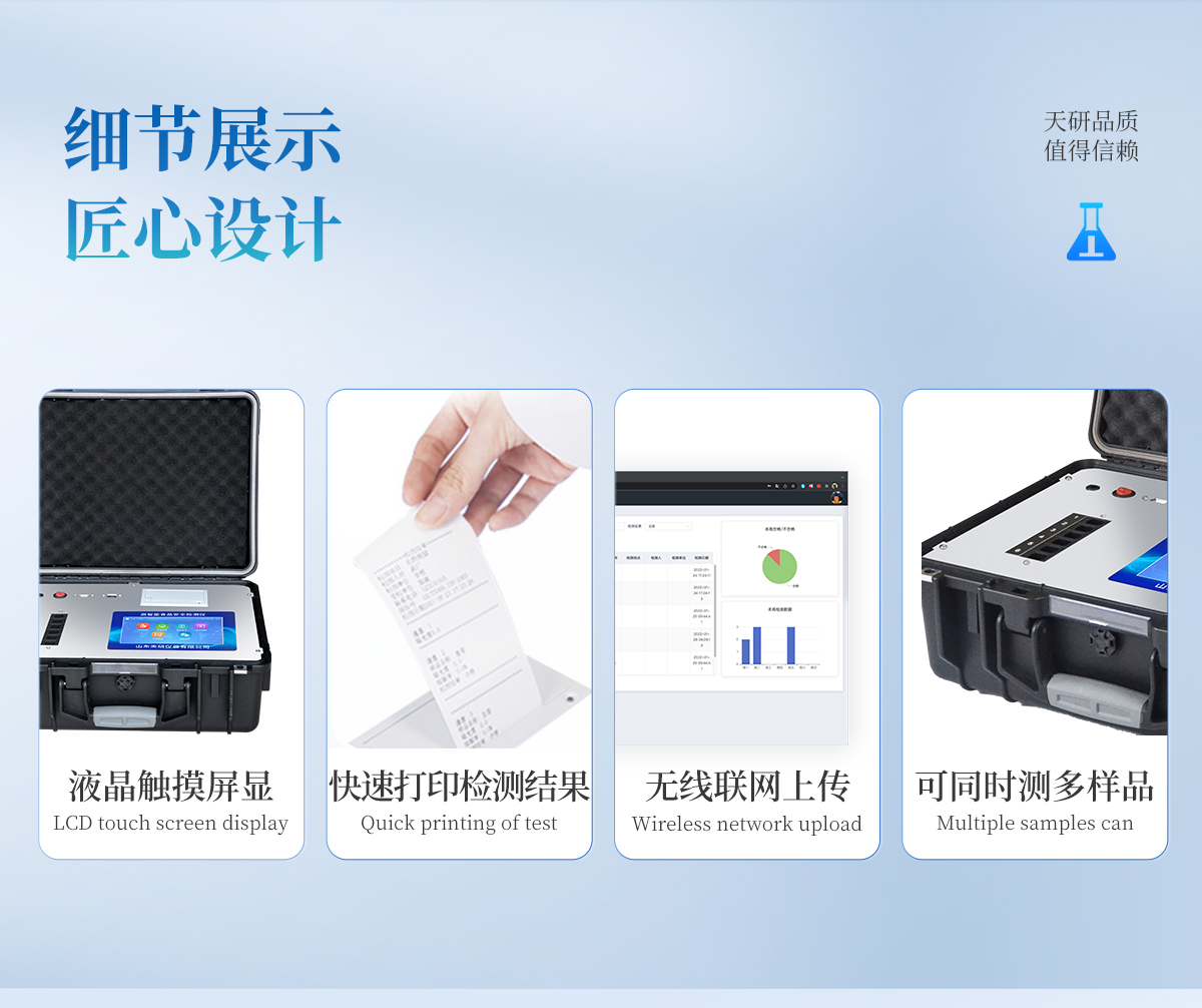 | 安卓智能操作系統(tǒng),采用更加**的UI交互界面,儀器具有wifi聯(lián)網(wǎng)上傳、4G聯(lián)網(wǎng)傳輸、GPRS無線遠傳、網(wǎng)線連接功能,快速批量上傳數(shù)據(jù)。 | 智能化程度高,儀器具有自檢功能:具有開機自檢和調零功能,具有自動檢測重復性功能。 | 新一代高速熱敏打印機,檢測完成可自動打印或批量打印檢測報告和二維碼。 | 儀器帶有監(jiān)管平臺,數(shù)據(jù)可局域網(wǎng)和互聯(lián)網(wǎng)數(shù)據(jù)上傳,檢測結果直接傳至食品安全監(jiān)管平臺。進行區(qū)域食品安全監(jiān)管及大數(shù)據(jù)分析處理與數(shù)據(jù)統(tǒng)計,檢測區(qū)域食品安全長短期動態(tài),達到食品安全問題預估、預警 | 一體化主機,包含食品安全檢測模塊、多通道農(nóng)藥殘留檢測模塊、膠體金免疫層析檢測模塊。 | 一體化便攜式快檢設備,滿足現(xiàn)場及流動檢測使用需求,能夠在同一軟件下實現(xiàn)所有檢測項目的檢測,并可通過同一窗口直觀顯示檢測結果。 | 膠體金模塊檢測方式:軌道式自動傳輸掃描,檢測完成后自動退出檢測卡。 | CT線自動識別,無需手動調整。 | 內(nèi)置強大的數(shù)據(jù)庫,具有多品類多種類樣品菜單功能,可靈活選擇檢測樣品,不同的檢測通道可同時檢測不同的樣品項目。也可在儀器上直接編輯錄入樣品名稱、檢測指標、送檢單位等信息并保存進樣品數(shù)據(jù)庫。 | 產(chǎn)品內(nèi)置操作演示視頻,是您身邊的化驗指導專家。 | 樣品處理簡單省力,整體操作快速、安全、便捷。 | 儀器具有自身保護功能,可設置用戶名及密碼,防止非工作人員操作等。 | 高靈敏度,高檢測精度,高重復性精度,掃描式高精度光學傳感器。 | 結果判定線可修改,對照值標定值可保存,斷電不丟失數(shù)據(jù)。 | 兼容市場上所有的膠體金卡,使用耗材不受限制,極大增強用戶使用體驗。 | 儀器具有重新校準、鎖定、恢復出廠設置功能。 |