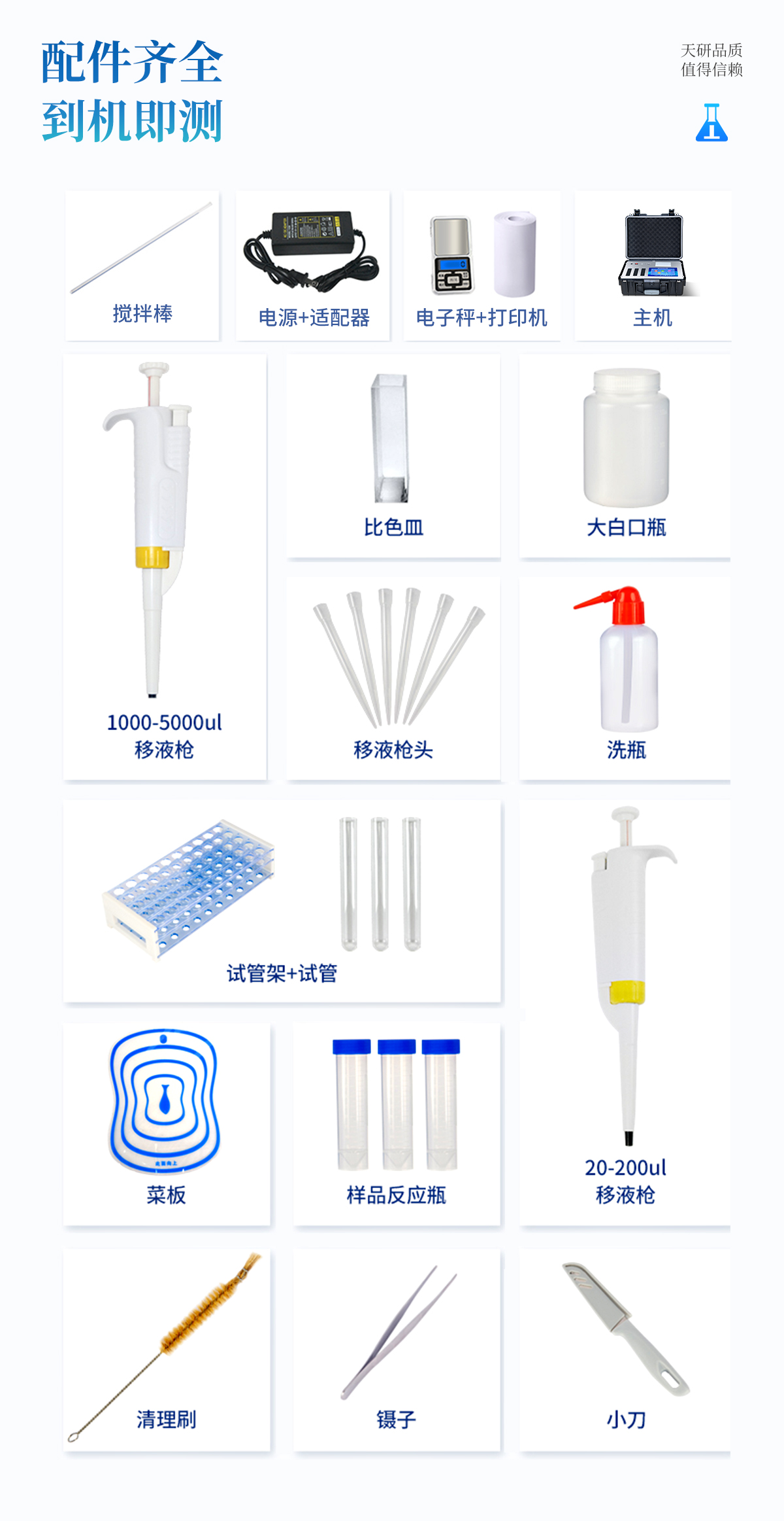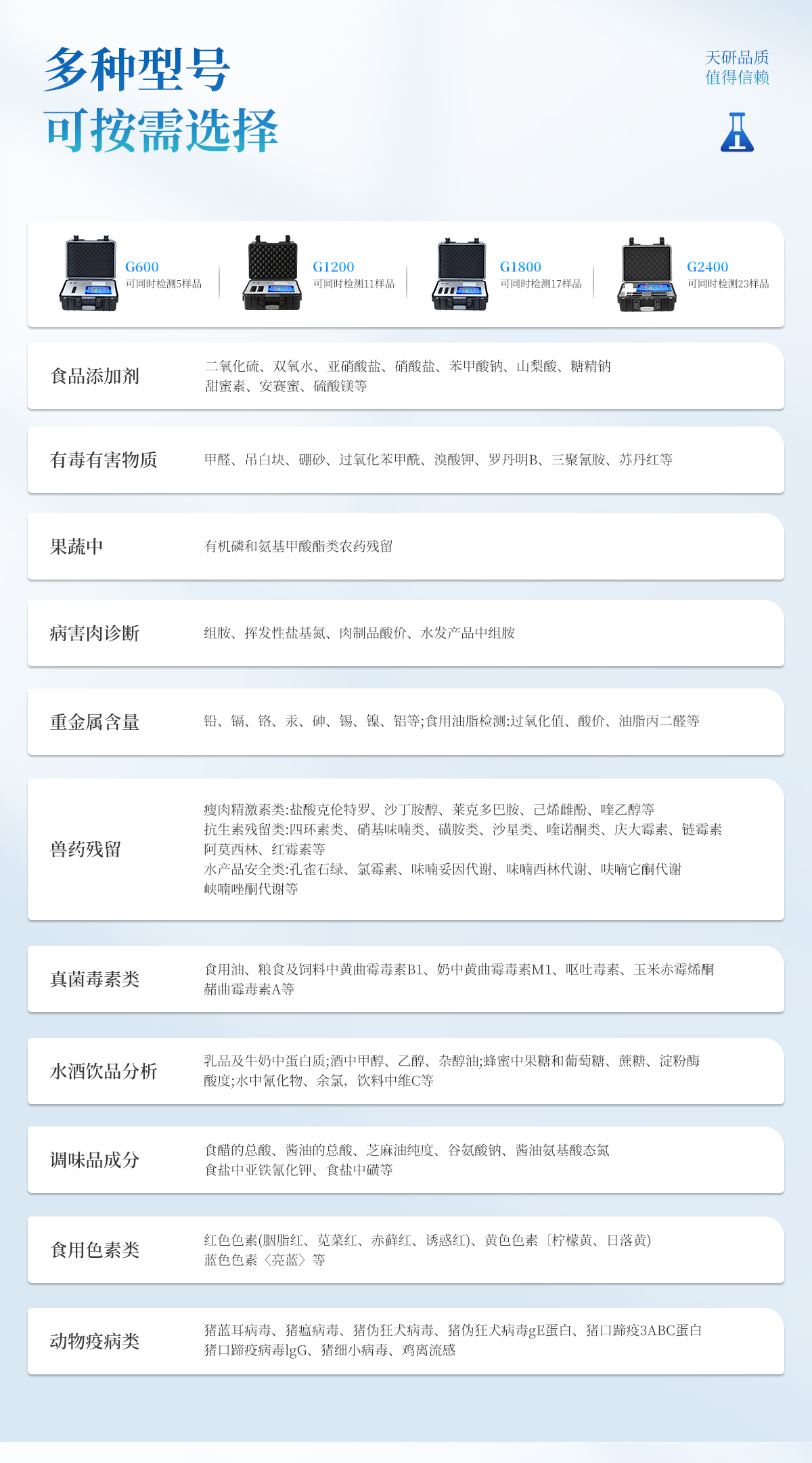 | 食品添加劑:二氧化硫、雙氧水、亞硝酸鹽、硝酸鹽、苯甲酸鈉、山梨酸、糖精鈉、甜蜜素、安賽蜜、硫酸鎂等 | 有毒有害物質(zhì):甲醛、吊白塊、硼砂、過氧化苯甲酰、溴酸鉀、羅丹明B、三聚氰胺、蘇丹紅等 | 果蔬中:有機(jī)磷和氨基甲酸酯類農(nóng)藥殘留; | 病害肉診斷:組胺、揮發(fā)性鹽基氮、肉制品酸價(jià)、水發(fā)產(chǎn)品中組胺 | 重金屬含量:鉛、鎘、鉻、汞、砷、錫、鎳、鋁等;食用油脂檢測(cè):過氧化值、酸價(jià)、油脂丙二醛等。 | 瘦肉精激素類(獸藥):鹽酸克倫特羅、沙丁胺醇、萊克多巴胺、己烯雌酚、喹乙醇等 | 抗生素殘留類(獸藥):四環(huán)素類、硝基呋喃類、磺胺類、沙星類、喹諾酮類、慶大霉素、鏈霉素、阿莫西林、紅霉素等 | 水產(chǎn)品安全類:孔雀石綠、氯霉素、呋喃妥因代謝、呋喃西林代謝、呋喃它酮代謝、呋喃唑酮代謝等 | 真菌毒素類:食用油、糧食及飼料中黃曲霉毒素B1、奶中黃曲霉毒素M1、嘔吐毒素、玉米赤霉烯酮、赭曲霉毒素A等 | 水酒飲品分析:乳品及牛奶中蛋白質(zhì);酒中甲醇、乙醇、雜醇油;蜂蜜中果糖和葡萄糖、蔗糖、淀粉酶、酸度;水中氰化物、余氯,飲料中維C等 | 調(diào)味品成分:食醋的總酸、醬油的總酸、芝麻油純度、谷氨酸鈉、醬油氨基酸態(tài)氮、食鹽中亞鐵氰化鉀、食鹽中碘等 | 食用色素類:紅色色素(胭脂紅、莧菜紅、赤蘚紅、誘惑紅)、黃色色素(檸檬黃、日落黃)、藍(lán)色色素(亮藍(lán))等 | 動(dòng)物疫病類:豬藍(lán)耳病毒、豬瘟病毒、豬偽狂犬病毒、豬偽狂犬病毒gE蛋白、豬口蹄疫3ABC蛋白、豬口蹄疫病毒IgG、豬細(xì)小病毒、雞禽流感等 |