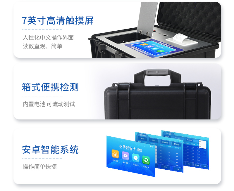 | 機(jī)器采用全新安卓智能系統(tǒng),主控芯片采用 ARM Cortex-A7,RK3288/4核處理器,主頻1.88Ghz,運(yùn)轉(zhuǎn)速度更快速,穩(wěn)定性更強(qiáng)。 | 創(chuàng)新檢測(cè)模式: *儀器采用精密旋轉(zhuǎn)比色池設(shè)計(jì),使用光源一致,可以解決各通道間由于光源誤差帶來的檢測(cè)結(jié)果誤差問題,檢測(cè)結(jié)果更加精準(zhǔn)。 *儀器具有自動(dòng)識(shí)別比色皿檢測(cè)功能,即:將樣品比色皿放入儀器后,點(diǎn)擊樣品檢測(cè),儀器自動(dòng)識(shí)別比色皿進(jìn)行通道檢測(cè)。 | 供電方式:交直流兩用,直流 12V 供電,可連接車載電源,可配 6ah 大容量充電鋰電池,方便戶外流動(dòng)測(cè)試。 | 顯示方式:7英寸液晶觸摸屏顯示,人性化中文操作界面,讀數(shù)直觀、簡(jiǎn)單。 | 檢測(cè)通道:8個(gè)檢測(cè)通道,可以同時(shí)測(cè)試多個(gè)樣品,循環(huán)檢測(cè),即放即檢,每個(gè)樣品由程序控制分別獨(dú)立工作,不會(huì)互相干擾。 | 高精光源系統(tǒng): ①儀器光源采用進(jìn)口超高亮發(fā)光二極管,光源亮度可以自動(dòng)調(diào)節(jié)與校準(zhǔn) ②智能恒流穩(wěn)壓,光強(qiáng)自動(dòng)校準(zhǔn),長時(shí)間連續(xù)工作光源無溫漂現(xiàn)象。 | 智能操作分析系統(tǒng): ①儀器具有100多種蔬菜名稱菜單庫,分類管理,并可按需添加或刪除、編輯蔬菜名稱;可在同一檢測(cè)界面自動(dòng)對(duì)應(yīng)相關(guān)檢測(cè)通道一次性選擇1-24個(gè)樣品名稱,無需退出界面,節(jié)省操作時(shí)間。 ②內(nèi)置新國家限量標(biāo)準(zhǔn),與所測(cè)結(jié)果進(jìn)行現(xiàn)場(chǎng)比對(duì),并持續(xù)更新標(biāo)準(zhǔn)。 | 完善的配套硬件: ①采用串口5v打印機(jī),可選擇手動(dòng)打印或者自動(dòng)打印,三分鐘出打印結(jié)果,打印格式為檢測(cè)人姓名、吸光度差值、檢測(cè)時(shí)間、檢測(cè)機(jī)構(gòu)、樣品名稱及結(jié)果判定。 ②儀器具有無線上傳模塊,檢測(cè)結(jié)果可批量打印,批量上傳。 | 數(shù)據(jù)調(diào)用: ①儀器可存儲(chǔ)20萬條檢測(cè)結(jié)果, ②檢測(cè)結(jié)果為Excel表格,方便后期進(jìn)行數(shù)據(jù)分析與匯總報(bào)告 ③儀器采用USB2.0接口設(shè)計(jì),支持 U 盤存儲(chǔ),方便數(shù)據(jù)的存貯和移動(dòng),并可隨時(shí)與計(jì)算機(jī)直接相連,實(shí)現(xiàn)數(shù)據(jù)查詢、瀏覽、分析、統(tǒng)計(jì)、打印等。 | 后期產(chǎn)品固件可升級(jí)。 | 安全證書,放心保障:儀器具有中國計(jì)量科學(xué)研究院校準(zhǔn)證書,**認(rèn)證,使用放心。 | 機(jī)箱采用工業(yè)級(jí)ABS工程塑料箱,方便攜帶,穩(wěn)固耐用,便于流動(dòng)測(cè)試。 |