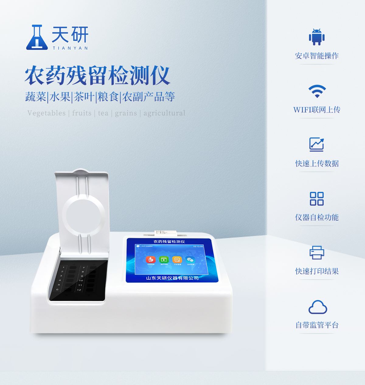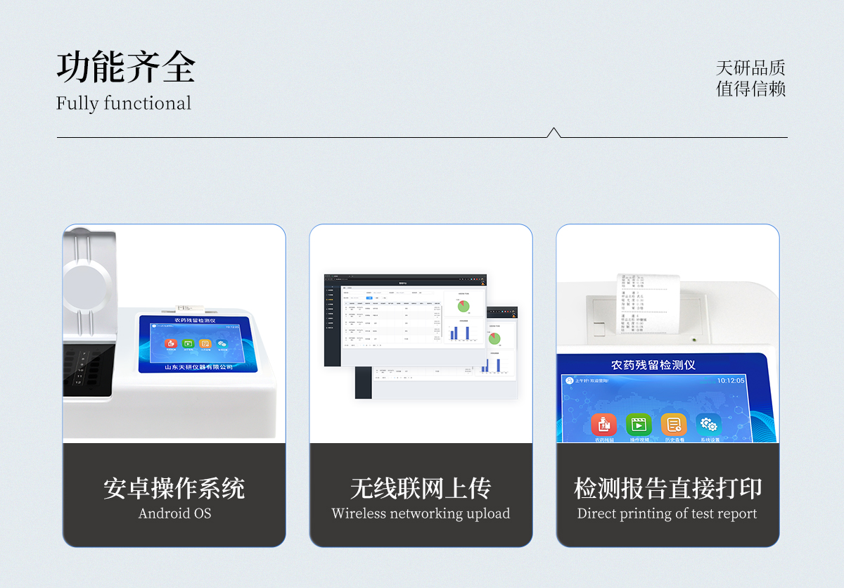 | 乙酰膽堿酯酶和丁酰膽堿酯酶試劑均可以使用,符合國家標(biāo)準(zhǔn)和農(nóng)業(yè)部標(biāo)準(zhǔn)的要求。 | 自動判斷樣品是否合格,檢測結(jié)果更加直觀。 | 儀器具有100多種蔬菜名稱菜單庫,分類管理,并可按需添加或刪除蔬菜名,編輯蔬菜名稱,可直接打印出蔬菜名稱。 | 檢測通道:10個檢測通道,可以同時測試多個樣品,循環(huán)檢測,即放即檢,每個樣品由程序控制分別獨立工作,不會互相干擾。 | 智能操作系統(tǒng),采用更加人性化操作,主控采用多核處理器,主頻1.88Ghz,運轉(zhuǎn)速度更快速,穩(wěn)定性更強。 | 顯示方式:7英寸高靈敏真彩觸摸屏顯示,人性化中文操作界面,讀數(shù)直觀、簡單。 | 打印機采用串口5v打印,可選擇手動打印或者自動打印,三分鐘出打印結(jié)果,打印格式為檢測人姓名、吸光度差值、檢測時間、檢測機構(gòu)、樣品名稱及結(jié)果判定。 | 光源采用進口超高亮發(fā)光二極管,具有低功耗、高精度、穩(wěn)定性強、光源可控可以關(guān)掉不使用的光源,響應(yīng)速度快等優(yōu)點。 | 智能恒流穩(wěn)壓,光強自動校準(zhǔn),長時間連續(xù)工作光源無溫漂現(xiàn)象。 | 儀器具有GPRS遠傳功能,可插手機卡實現(xiàn)數(shù)據(jù)遠傳平臺,wifi聯(lián)網(wǎng)功能,可將數(shù)據(jù)快速上傳電腦,進行數(shù)據(jù)管理與統(tǒng)計。 | 采用USB2.0接口設(shè)計,方便數(shù)據(jù)的存貯和移動,并可隨時與計算機直接相連,并且可用計算機控制儀器。實現(xiàn)數(shù)據(jù)查詢、瀏覽、分析、統(tǒng)計、打印等。 | 智能化程度高,儀器具有自檢功能:具有開機自檢和調(diào)零功能,具有自動檢測重復(fù)性功能 | 儀器具有自身保護功能,可設(shè)置用戶名及密碼,防止非工作人員操作等。 | 采用DC12v直流供電,安全系統(tǒng)更高,并且配備6A鋰電池充電器。 | 儀器具有重新校準(zhǔn)、鎖定、恢復(fù)出廠設(shè)置功能。 |