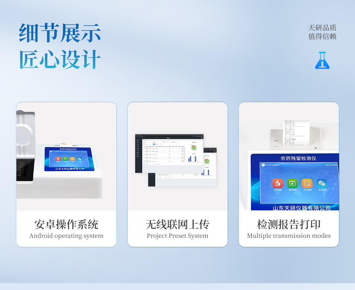 | 乙酰膽堿酯酶和丁酰膽堿酯酶試劑均可以使用,符合國(guó)家標(biāo)準(zhǔn)和農(nóng)業(yè)部標(biāo)準(zhǔn)的要求。 | 自動(dòng)判斷樣品是否合格,檢測(cè)結(jié)果更加直觀。 | 儀器具有100多種蔬菜名稱菜單庫(kù),分類管理,并可按需添加或刪除蔬菜名,編輯蔬菜名稱,可直接打印出蔬菜名稱。 | 檢測(cè)通道:16個(gè)檢測(cè)通道,可以同時(shí)測(cè)試多個(gè)樣品,循環(huán)檢測(cè),即放即檢,每個(gè)樣品由程序控制分別獨(dú)立工作,不會(huì)互相干擾。 | 智能操作系統(tǒng),采用更加人性化操作,主控采用多核處理器,主頻1.88Ghz,運(yùn)轉(zhuǎn)速度更快速,穩(wěn)定性更強(qiáng)。 | 顯示方式:7英寸高靈敏真彩觸摸屏顯示,人性化中文操作界面,讀數(shù)直觀、簡(jiǎn)單。 | 打印機(jī)采用串口5v打印,可選擇手動(dòng)打印或者自動(dòng)打印,三分鐘出打印結(jié)果,打印格式為檢測(cè)人姓名、吸光度差值、檢測(cè)時(shí)間、檢測(cè)機(jī)構(gòu)、樣品名稱及結(jié)果判定。 | 光源采用進(jìn)口超高亮發(fā)光二極管,具有低功耗、高精度、穩(wěn)定性強(qiáng)、光源可控可以關(guān)掉不使用的光源,響應(yīng)速度快等優(yōu)點(diǎn)。 | 智能恒流穩(wěn)壓,光強(qiáng)自動(dòng)校準(zhǔn),長(zhǎng)時(shí)間連續(xù)工作光源無(wú)溫漂現(xiàn)象。 | 儀器具有GPRS遠(yuǎn)傳功能,可插手機(jī)卡實(shí)現(xiàn)數(shù)據(jù)遠(yuǎn)傳平臺(tái),wifi聯(lián)網(wǎng)功能,可將數(shù)據(jù)快速上傳電腦,進(jìn)行數(shù)據(jù)管理與統(tǒng)計(jì)。 | 采用USB2.0接口設(shè)計(jì),方便數(shù)據(jù)的存貯和移動(dòng),并可隨時(shí)與計(jì)算機(jī)直接相連,并且可用計(jì)算機(jī)控制儀器。實(shí)現(xiàn)數(shù)據(jù)查詢、瀏覽、分析、統(tǒng)計(jì)、打印等。 | 智能化程度高,儀器具有自檢功能:具有開(kāi)機(jī)自檢和調(diào)零功能,具有自動(dòng)檢測(cè)重復(fù)性功能 | 儀器具有自身保護(hù)功能,可設(shè)置用戶名及密碼,防止非工作人員操作等。 | 采用DC12v直流供電,安全系統(tǒng)更高,并且配備6A鋰電池充電器。 | 儀器具有重新校準(zhǔn)、鎖定、恢復(fù)出廠設(shè)置功能。 |