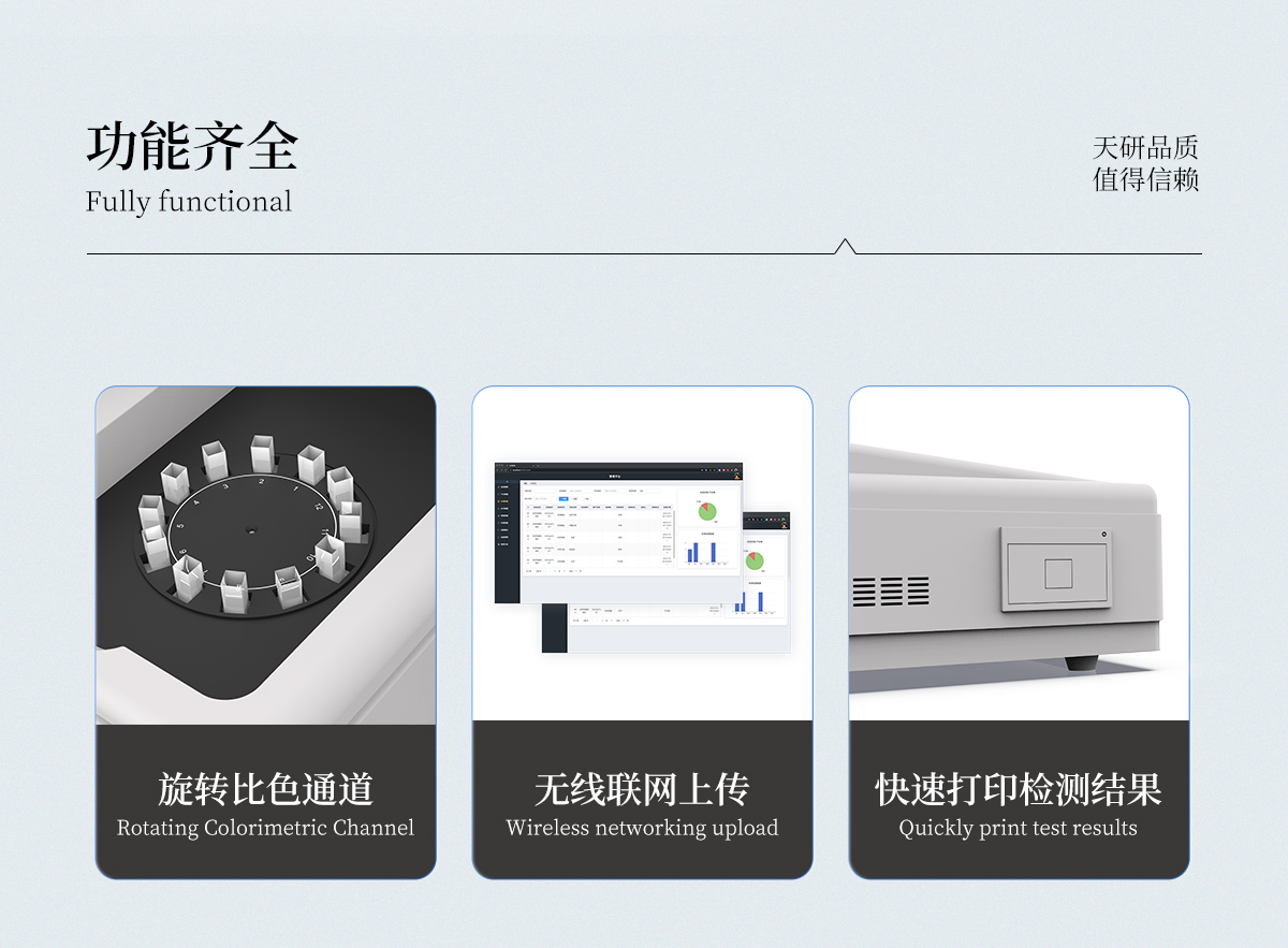 | 1、智能**且方便 | ①智能芯片:主控芯片采用ARM Cortex-A7,RK3288/4核處理器,搭配安卓智能操作系統(tǒng),集實(shí)驗(yàn)操作,分析結(jié)果,打印報(bào)告等功能于一體,使用方便,性能更強(qiáng)。 | ②大屏顯示:采用10.1英寸液晶觸摸屏,單機(jī)即可操作,無(wú)需連接外部顯示或控制器。 | ③多樣同檢:儀器具有12個(gè)檢測(cè)通道,可同時(shí)一次性檢測(cè)11個(gè)樣品,效率更高。 | ④工作預(yù)設(shè):具有任務(wù)預(yù)設(shè)模塊,一鍵提前預(yù)設(shè)樣品所有信息內(nèi)容。來(lái)樣時(shí)可直接檢測(cè),同時(shí)可多次調(diào)取。 | ⑤數(shù)據(jù)分析:設(shè)備首頁(yè)自動(dòng)匯總分析數(shù)據(jù),并繪制柱形分析圖,各項(xiàng)檢測(cè)數(shù)據(jù)一目了然,快捷直觀。 | ⑥高度集成:模塊高度集合,將分光光度模塊、數(shù)字化管理模塊、無(wú)線通訊模塊集成于一體??蓪z測(cè)結(jié)果進(jìn)行分析,直接上傳至數(shù)據(jù)平臺(tái),實(shí)現(xiàn)數(shù)據(jù)共享,方便后期進(jìn)行數(shù)據(jù)分析與統(tǒng)計(jì)。 | ⑦遠(yuǎn)程升級(jí):儀器具備遠(yuǎn)程升級(jí)功能,可遠(yuǎn)程升級(jí)程序,無(wú)需返廠,并可持續(xù)性免費(fèi)更新系統(tǒng)版本,降低成本及運(yùn)輸損耗風(fēng)險(xiǎn)。 | 2、檢測(cè)精準(zhǔn)且直觀 | ①**技術(shù):精密旋轉(zhuǎn)比色池,使用同芯片同光源校準(zhǔn)精度,解決不同光源之間存在波長(zhǎng)誤差的問(wèn)題,更加準(zhǔn)確**。 | ②結(jié)果直觀:儀器自動(dòng)對(duì)檢測(cè)結(jié)果與國(guó)標(biāo)限量值進(jìn)行對(duì)比,自動(dòng)判定結(jié)果是否合格,結(jié)果更直觀。 | 3、功能強(qiáng)大且實(shí)用 | ①存儲(chǔ)功能:設(shè)備可以存儲(chǔ)數(shù)據(jù)100000組,可在屏幕上直觀查看歷史數(shù)據(jù),可導(dǎo)出數(shù)據(jù)。 | ②打印功能:設(shè)備自帶打印功能,可對(duì)樣品信息及檢測(cè)結(jié)果無(wú)限次隨意打印。 | ③全新方式:新創(chuàng)自定義打印方式,可按需靈活勾選控制:二維碼,抽樣信息、檢測(cè)信息,受檢信息、復(fù)核信息、抽樣日期、檢測(cè)日期等信息的打印 | ④多重編輯:樣品信息可多重編輯,可以對(duì)每個(gè)通道屬性和樣品信息單獨(dú)進(jìn)行編輯,例如樣品信息、抽樣信息、檢測(cè)信息,受檢信息、復(fù)核信息、抽樣日期、檢測(cè)日期等信息等。 | ⑤雙語(yǔ)設(shè)計(jì):全中文/英文操作菜單,簡(jiǎn)單實(shí)用,適用于不同用戶的需求。 |