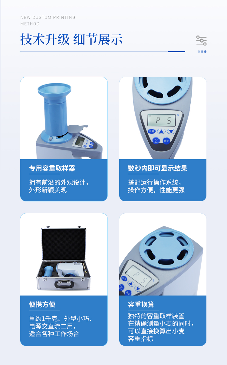 容重換算:獨特的**容重取樣裝置在**測量小麥的同時,可以直接換算出小麥容重指標(biāo)。