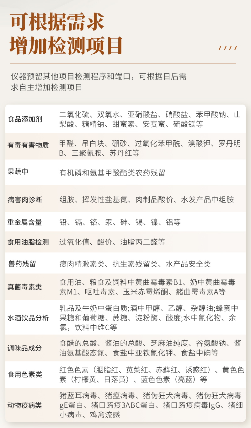 | 儀器采用手提式一體化系統(tǒng)檢測技術(shù),將分光光度模塊、膠體金檢測模塊、新型農(nóng)殘檢測模塊、數(shù)字化管理模塊、無線通訊模塊高度集成于一體,支持檢測200種食品安全檢測項目,同時預(yù)留升級檢測方法。 | 儀器檢測模塊標(biāo)準(zhǔn)化、智能化,可隨意自由組合。檢測箱體內(nèi)置多個標(biāo)準(zhǔn)檢測單元,檢測模塊可以調(diào)整配置。 | 儀器采用全新安卓智能系統(tǒng),主控芯片采用 ARM Cortex-A7,RK3288/4核處理器,10.1寸高清液晶觸摸豎屏,更加**的UI交互界面,運(yùn)轉(zhuǎn)快捷;儀器配備無線通信模塊: 4G(APN)通訊模塊、Wifi模塊,藍(lán)牙傳輸,同時具有雙USB接口以及RJ45接口能以多種方式實(shí)現(xiàn)數(shù)據(jù)保存和數(shù)據(jù)傳輸功能。 | 創(chuàng)新檢測模式:★檢測通道:≥12通道;采用精密旋轉(zhuǎn)比色池設(shè)計,使用同芯片同光源校準(zhǔn)精度,解決不同光源之間的誤差值。1-12通道間誤差0.1%。(**號:ZL202022821055.2) | ★儀器具有自動識別比色皿檢測功能,即:將樣品比色皿放入儀器后,點(diǎn)擊樣品檢測,儀器自動識別比色皿進(jìn)行通道檢測。 | 進(jìn)口高精光源: | 高精度進(jìn)口四波長冷光源,通道配置 410、520、590、630nm 波長光源,一個光源芯片驅(qū)動一個光源,誤差極小,每臺設(shè)備單獨(dú)**校準(zhǔn)光源,**比對,同時參照四種不同波段光源全方位覆蓋市面上99%的農(nóng)殘食品項目檢測。 | 膠體金模塊檢測方式:★采用COMS實(shí)時成像技術(shù),單金標(biāo)實(shí)時讀卡,通過不同顏色的灰度變化,一秒精準(zhǔn)得出結(jié)果。 | 智能操作分析系統(tǒng):★便捷操作系統(tǒng):設(shè)備檢測時可在同一檢測界面自動對應(yīng)相關(guān)檢測通道一次性選擇1-12個樣品名稱,無須退出界面,節(jié)省操作時間。 | ★數(shù)據(jù)集成系統(tǒng):設(shè)備首頁自動統(tǒng)計檢測數(shù)據(jù)包含:周檢測數(shù)據(jù)、月檢測數(shù)據(jù),全部檢測總數(shù)量,均包含檢測總數(shù),合格數(shù),不合格數(shù),以及相關(guān)柱形分析圖,對各項檢測數(shù)據(jù)清晰掌握,無需電腦查詢,更加快捷直觀。 | ★項目預(yù)設(shè)系統(tǒng):支持添加單個及多個相同或不相同的任務(wù)預(yù)設(shè),一鍵快速調(diào)取,每一個任務(wù)分別可以設(shè)置不同的樣品、批次、編號、來源、備注、抽樣信息、檢測信息、受檢信息、復(fù)核信息等更多信息。無縫鏈接平臺和APP實(shí)時查看下發(fā)任務(wù)。 | ★數(shù)據(jù)監(jiān)管系統(tǒng):同步對接監(jiān)管平臺,數(shù)據(jù)可局域網(wǎng)和互聯(lián)網(wǎng)數(shù)據(jù)上傳,檢測結(jié)果可選擇直接傳至食品安全監(jiān)管平臺。集成OSS輸出存儲服務(wù)、區(qū)分設(shè)備定向管理應(yīng)用,進(jìn)行區(qū)域食品安全監(jiān)管及大數(shù)據(jù)分析處理與數(shù)據(jù)統(tǒng)計,檢測區(qū)域食品安全長短期動態(tài),達(dá)到食品安全問題預(yù)估、預(yù)警。 | ★自定義打印系統(tǒng):內(nèi)置全新打印系統(tǒng),新創(chuàng)自定義打印方式,可按需靈活設(shè)置開啟或關(guān)閉:產(chǎn)品合格證(國家農(nóng)業(yè)部標(biāo)準(zhǔn)要求),二維碼,抽樣信息、檢測信息,受檢信息、復(fù)核信息、抽樣日期、檢測日期等信息的打印。 | ★系統(tǒng)遠(yuǎn)程更新功能:可定向分客戶分儀器更新系統(tǒng),按照不同客戶后期實(shí)際需求添加項目,無需機(jī)器返廠,即可遠(yuǎn)程實(shí)時升級全新系統(tǒng),節(jié)省時間成本及避免運(yùn)輸造成設(shè)備損壞。 | 儀器主機(jī)采用一體化防水、抗壓、防撞擊、防腐蝕箱體設(shè)計,同時配備交直流供電,可連接車載電源,可選配大容量充電鋰電池,滿足現(xiàn)場野外檢測需求。 | 安全證書,放心保障:儀器具有中國計量科學(xué)研究院校準(zhǔn)證書,**認(rèn)證。 |