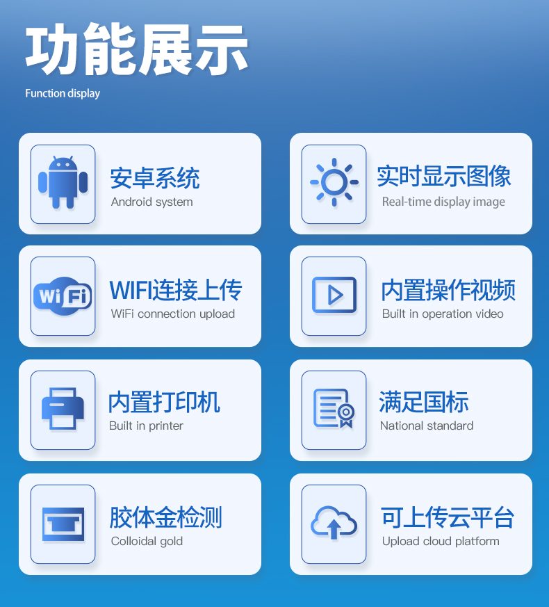 | 儀器采用10.1英寸液晶觸摸屏顯,搭配運(yùn)行安卓智能操作系統(tǒng),主控芯片采用ARM Cortex-A7,RK3288/4核處理器,主頻1.88Ghz,運(yùn)轉(zhuǎn)速度更快速,性能更強(qiáng)。 | 儀器功能包括:膠體金檢測(cè)模塊、數(shù)字化管理模塊、無線通訊模塊等,可以滿足同一軟件下實(shí)現(xiàn)所有檢測(cè)項(xiàng)目的檢測(cè),并在同一窗口展示檢測(cè)結(jié)果。 | 一體化便攜式快檢設(shè)備,采用交直流兩用供電方式,可連接車載電源,配備6ah大容量充電鋰電池,可以滿足現(xiàn)場(chǎng)及流動(dòng)檢測(cè)使用的需求。儀器尺寸:43×35×20cm, 主機(jī)凈重:5.1kg | 系統(tǒng)自帶數(shù)據(jù)集成模塊,設(shè)備首頁(yè)自動(dòng)統(tǒng)計(jì)檢測(cè)數(shù)據(jù)包含:周檢測(cè)數(shù)據(jù)、月檢測(cè)數(shù)據(jù),全部檢測(cè)總數(shù)量,均包含檢測(cè)總數(shù),合格數(shù),不合格數(shù),以及相關(guān)柱形分析圖,對(duì)各項(xiàng)檢測(cè)數(shù)據(jù)清晰掌握,無需電腦查詢,更加快捷直觀。 | 儀器具有任務(wù)預(yù)設(shè)模塊,可在樣品送檢前提前預(yù)設(shè)樣品名稱、檢測(cè)指標(biāo)、送檢單位等信息,樣品送檢時(shí)一鍵調(diào)取保存信息,檢測(cè)更加方便快捷。 | 膠體金檢測(cè)模塊:軌道式自動(dòng)傳輸掃描方式,可實(shí)時(shí)顯示金標(biāo)卡實(shí)時(shí)圖像,系統(tǒng)自動(dòng)分析并呈現(xiàn)出CT曲線圖,CT線自動(dòng)識(shí)別,無需手動(dòng)調(diào)整,完成檢測(cè)后自動(dòng)退出檢測(cè)卡。 結(jié)果判定線可修改,對(duì)照值標(biāo)定值可保存,斷電不丟失數(shù)據(jù)。 兼容市場(chǎng)上其他膠體金卡,使用耗材不受限制,極大增強(qiáng)用戶使用體驗(yàn)。 | 儀器檢測(cè)系統(tǒng)擁有龐大數(shù)據(jù)庫(kù),并且構(gòu)建了完善的檢索、修訂功能。食品庫(kù)涵蓋多種樣品名稱,可按需添加或刪除、編輯樣品名稱;產(chǎn)品數(shù)據(jù)庫(kù)以及歷史檢測(cè)記錄支持一鍵檢索功能。 | 系統(tǒng)打印自定義化,打印格式多樣化,產(chǎn)品合格證(國(guó)家標(biāo)準(zhǔn)要求),二維碼,抽樣信息、檢測(cè)信息,受檢信息、復(fù)核信息、抽樣日期、檢測(cè)日期等信息結(jié)果,可按需求自行設(shè)置打印內(nèi)容。 | A4紙版本報(bào)告打印功能(可選配):設(shè)備擁有兩種結(jié)果展示方式,可以自動(dòng)生成A4打印模板和小票打印模板兩種樣式,可通過WiFi及網(wǎng)線等方式鏈接外置打印機(jī)可進(jìn)行打印 | 儀器具有 wifi 聯(lián)網(wǎng)上傳、RJ45網(wǎng)線連接功能,可以快速上傳數(shù)據(jù)。同步對(duì)接監(jiān)管平臺(tái),數(shù)據(jù)可局域網(wǎng)和互聯(lián)網(wǎng)數(shù)據(jù)上傳,檢測(cè)結(jié)果直接傳至食品安全監(jiān)管平臺(tái)。進(jìn)行區(qū)域食品安全監(jiān)管及大數(shù)據(jù)分析處理與數(shù)據(jù)統(tǒng)計(jì),檢測(cè)區(qū)域食品安全長(zhǎng)短期動(dòng)態(tài),達(dá)到食品安全問題預(yù)估、預(yù)警。 | 設(shè)備支持U盤存儲(chǔ),標(biāo)準(zhǔn)USB接口,免驅(qū)動(dòng)安裝。檢測(cè)結(jié)果存儲(chǔ)容量20萬(wàn)條以上,可生成Excel表格,進(jìn)行一鍵拷貝,并具有登錄保護(hù)功能,可設(shè)置用戶名及密碼,規(guī)范不同人員操作權(quán)限,防止非工作人員操作,并且可以進(jìn)行重新校準(zhǔn)、鎖定、恢復(fù)出廠設(shè)置功能。儀器固件可升級(jí),后期檢測(cè)項(xiàng)目可擴(kuò)充。 | 儀器具備遠(yuǎn)程升級(jí)功能,可定向分客戶分儀器更新,開機(jī)后自動(dòng)更新,并可持續(xù)性免費(fèi)更新系統(tǒng)版本,無需像傳統(tǒng)產(chǎn)品返廠更新,節(jié)省時(shí)間及人力成本并避免了物流運(yùn)輸返廠升級(jí)導(dǎo)致設(shè)備損壞的潛在風(fēng)險(xiǎn)。 |