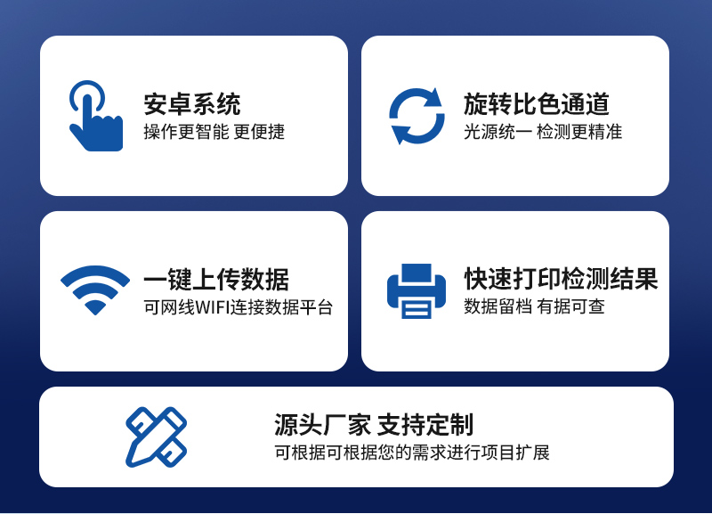 | 儀器采用臺式一體化系統(tǒng)檢測技術(shù),新型農(nóng)殘檢測模塊、數(shù)字化管理模塊、無線通訊模塊高度集成于一體,同時預(yù)留升級檢測方法。 | 儀器檢測模塊標(biāo)準(zhǔn)化、智能化,可隨意自由組合。檢測箱體內(nèi)置多個標(biāo)準(zhǔn)檢測單元,檢測模塊可以調(diào)整配置。 | 儀器采用全新安卓智能系統(tǒng),主控芯片采用 ARM Cortex-A7,RK3288/4核處理器,10.1寸高清液晶觸摸豎屏,更加**的UI交互界面,運(yùn)轉(zhuǎn)快捷;儀器配備無線通信模塊: 4G(APN)通訊模塊、Wifi模塊,藍(lán)牙傳輸,同時具有雙USB接口以及RJ45接口能以多種方式實(shí)現(xiàn)數(shù)據(jù)保存和數(shù)據(jù)傳輸功能。 | 創(chuàng)新檢測模式:檢測通道:≥24通道;采用精密旋轉(zhuǎn)比色池設(shè)計(jì),使用同芯片同光源校準(zhǔn)精度,解決不同光源之間的誤差值。1-12通道間誤差0.1%。(**號:ZL202022821055.2) 儀器具有自動識別比色皿檢測功能,即:將樣品比色皿放入儀器后,點(diǎn)擊樣品檢測,儀器自動識別比色皿進(jìn)行通道檢測。 | 進(jìn)口高精光源:高精度進(jìn)口四波長冷光源,通道配置 410、520、590、630nm 波長光源,一個光源芯片驅(qū)動一個光源,誤差極小,每臺設(shè)備單獨(dú)**校準(zhǔn)光源,**比對,同時參照四種不同波段光源全方位覆蓋市面上99%的農(nóng)殘食品項(xiàng)目檢測,可按照實(shí)際需求進(jìn)行食品項(xiàng)目檢測升級。 | 高精光源系統(tǒng): ①儀器光源采用進(jìn)口超高亮發(fā)光二極管,光源亮度可以自動調(diào)節(jié)與校準(zhǔn) ②智能恒流穩(wěn)壓,光強(qiáng)自動校準(zhǔn),長時間連續(xù)工作光源無溫漂現(xiàn)象。 | 智能操作分析系統(tǒng): | 便捷操作系統(tǒng):設(shè)備檢測時可在同一檢測界面自動對應(yīng)相關(guān)檢測通道一次性選擇1-24個樣品名稱,無須退出界面,節(jié)省操作時間。 | 數(shù)據(jù)集成系統(tǒng):設(shè)備首頁自動統(tǒng)計(jì)檢測數(shù)據(jù)包含:周檢測數(shù)據(jù)、月檢測數(shù)據(jù),全部檢測總數(shù)量,均包含檢測總數(shù),合格數(shù),不合格數(shù),以及相關(guān)柱形分析圖,對各項(xiàng)檢測數(shù)據(jù)清晰掌握,無需電腦查詢,更加快捷直觀。 | 項(xiàng)目預(yù)設(shè)系統(tǒng):支持添加單個及多個相同或不相同的任務(wù)預(yù)設(shè),一鍵快速調(diào)取,每一個任務(wù)分別可以設(shè)置不同的樣品、批次、編號、來源、備注、抽樣信息、檢測信息、受檢信息、復(fù)核信息等更多信息。 | 數(shù)據(jù)監(jiān)管系統(tǒng):同步對接監(jiān)管平臺,數(shù)據(jù)可局域網(wǎng)和互聯(lián)網(wǎng)數(shù)據(jù)上傳,檢測結(jié)果可選擇直接傳至食品安全監(jiān)管平臺。集成OSS輸出存儲服務(wù)、區(qū)分設(shè)備定向管理應(yīng)用,進(jìn)行區(qū)域食品安全監(jiān)管及大數(shù)據(jù)分析處理與數(shù)據(jù)統(tǒng)計(jì),檢測區(qū)域食品安全長短期動態(tài),達(dá)到食品安全問題預(yù)估、預(yù)警。 | 自定義打印系統(tǒng):內(nèi)置新創(chuàng)自定義打印系統(tǒng),可按需靈活設(shè)置開啟或關(guān)閉:產(chǎn)品合格證(國家農(nóng)業(yè)部標(biāo)準(zhǔn)),二維碼,抽樣信息、檢測信息,受檢信息、復(fù)核信息、抽樣日期、檢測日期等信息的打印。 | A4版本報告打印功能:設(shè)備可自動生成A4版報告,外接打印機(jī)即可打印 | 系統(tǒng)遠(yuǎn)程更新功能:可定向分客戶分儀器更新系統(tǒng),按照不同客戶后期實(shí)際需求添加項(xiàng)目,無需設(shè)備返廠,即可遠(yuǎn)程實(shí)時升級全新系統(tǒng),節(jié)省時間成本及避免運(yùn)輸造成設(shè)備損壞。 | 安全證書,放心保障:儀器具有中國計(jì)量科學(xué)研究院校準(zhǔn)證書,**認(rèn)證。 |