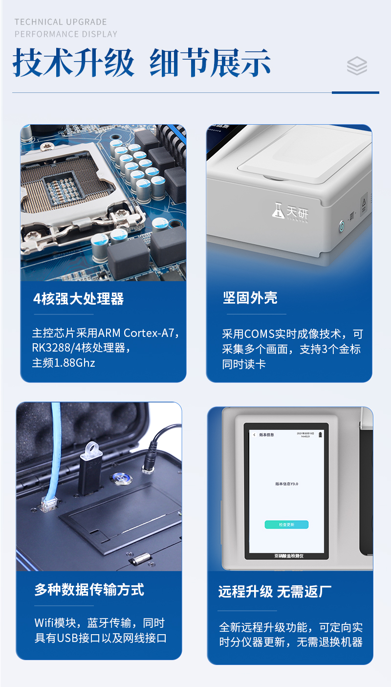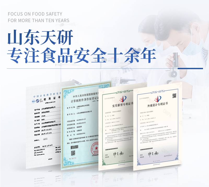 | 儀器采用臺(tái)式一體化系統(tǒng)檢測(cè)技術(shù),將分光光度模塊、數(shù)字化管理模塊、無(wú)線通訊模塊高度集成于一體,可支持檢測(cè)60種食品安全檢測(cè)項(xiàng)目,同時(shí)預(yù)留升級(jí)檢測(cè)方法。 | 儀器檢測(cè)模塊標(biāo)準(zhǔn)化、智能化,檢測(cè)項(xiàng)目可隨意自由組合。檢測(cè)箱體內(nèi)置多個(gè)標(biāo)準(zhǔn)檢測(cè)單元,檢測(cè)模塊可以調(diào)整配置。 | 顯示屏幕:儀器采用10.1英寸豎向液晶觸摸屏顯,搭配運(yùn)行安卓智能操作系統(tǒng),主控芯片采用ARM Cortex-A7,RK3288/4核處理器,主頻1.88Ghz,操作方便,性能更強(qiáng)。 | 檢測(cè)通道:≥12通道;采用精密旋轉(zhuǎn)比色池設(shè)計(jì),使用同芯片同光源校準(zhǔn)精度,解決不同光源之間的誤差值,更加準(zhǔn)確**。(1-12通道間誤差0.1%,**號(hào):ZL202022821055.2) | 儀器光源:高精度進(jìn)口四波長(zhǎng)冷光源,每個(gè)通道均配置 410、520、590、630nm 波長(zhǎng)光源,標(biāo)配**的光路切換裝置,**光路切換功能可實(shí)現(xiàn)64波長(zhǎng),并且所有檢測(cè)項(xiàng)目可實(shí)現(xiàn)所有通道同時(shí)檢測(cè)。 | 設(shè)備可一鍵校準(zhǔn),自動(dòng)保存校準(zhǔn)數(shù)據(jù),自動(dòng)對(duì)比校驗(yàn),得到精準(zhǔn)光源,采用Android SP存儲(chǔ)數(shù)據(jù),光源數(shù)據(jù)永不丟失,方便每一次使用。 | 通訊接口:配備無(wú)線通信模塊、4G(APN)通訊模塊、藍(lán)牙傳輸,同時(shí)具有雙USB接口以及RJ45網(wǎng)線接口,可以多方式實(shí)現(xiàn)數(shù)據(jù)保存及數(shù)據(jù)傳輸。 | 存儲(chǔ)方式:支持U盤存儲(chǔ),標(biāo)準(zhǔn)USB接口,免驅(qū)動(dòng)安裝。檢測(cè)結(jié)果存儲(chǔ)容量20萬(wàn)條以上,可生成Excel表格進(jìn)行拷貝,并具有登錄保護(hù)功能。 | 智能化操作系統(tǒng): | 1、操作系統(tǒng):儀器可在同一檢測(cè)界面自動(dòng)對(duì)應(yīng)相關(guān)檢測(cè)通道,一次性選擇1-12個(gè)樣品名稱,無(wú)需退出界面,節(jié)省操作時(shí)間。并可以對(duì)每個(gè)通道屬性和樣品信息單獨(dú)進(jìn)行編輯,例如送檢單位、人員,檢測(cè)人員等,打印時(shí)勾選打印顯示。 | 2、數(shù)據(jù)集成系統(tǒng):設(shè)備首頁(yè)自動(dòng)匯總分析檢測(cè)數(shù)據(jù),包含:周檢測(cè)數(shù)據(jù)、月檢測(cè)數(shù)據(jù),全部檢測(cè)總數(shù)量,均包含檢測(cè)總數(shù),合格數(shù),不合格數(shù),以及相關(guān)柱形分析圖,各項(xiàng)檢測(cè)數(shù)據(jù)一目了然,無(wú)需電腦查詢,更加快捷直觀。 | 3、數(shù)據(jù)庫(kù)系統(tǒng):十幾項(xiàng)數(shù)據(jù)庫(kù)分類管理儀器:包含項(xiàng)目類型、項(xiàng)目數(shù)據(jù)、檢測(cè)數(shù)據(jù)、歷史記錄、國(guó)標(biāo)信息、曲線信息、采樣信息、檢測(cè)信息、受檢信息、復(fù)核信息、圖表信息、光源校準(zhǔn)信息、打印樣式信息、樣品庫(kù)信息等等,數(shù)據(jù)庫(kù)之間互相協(xié)調(diào)聯(lián)動(dòng)保證數(shù)據(jù)的真實(shí)完整性。同時(shí)產(chǎn)品數(shù)據(jù)庫(kù)以及歷史檢測(cè)記錄支持一鍵檢索功能。 | 4、限量規(guī)判系統(tǒng):具有限量查詢、添加物質(zhì)合規(guī)判定系統(tǒng)。檢測(cè)出結(jié)果后,系統(tǒng)自動(dòng)調(diào)用系統(tǒng)數(shù)據(jù)庫(kù)中相關(guān)國(guó)標(biāo)進(jìn)行比對(duì)判定,客觀顯示判定結(jié)果是否合格。 | 5、項(xiàng)目預(yù)設(shè)系統(tǒng):儀器具有任務(wù)預(yù)設(shè)模塊,一鍵提前預(yù)設(shè),給出方便快捷的新檢測(cè)方案,每一個(gè)任務(wù)分別可以設(shè)置不同的樣品、批次、編號(hào)、來(lái)源、備注、抽樣信息、檢測(cè)信息、受檢信息、復(fù)核信息等更多信息。樣品送檢時(shí)一鍵調(diào)取保存信息,并可多次調(diào)取,大大提高檢測(cè)效率。 | 6、數(shù)據(jù)監(jiān)管系統(tǒng):同步對(duì)接監(jiān)管平臺(tái),數(shù)據(jù)可局域網(wǎng)和互聯(lián)網(wǎng)數(shù)據(jù)上傳,檢測(cè)結(jié)果可選擇直接傳至食品安全監(jiān)管平臺(tái)。進(jìn)行區(qū)域食品安全監(jiān)管及大數(shù)據(jù)分析處理與數(shù)據(jù)統(tǒng)計(jì),檢測(cè)區(qū)域食品安全長(zhǎng)短期動(dòng)態(tài),達(dá)到食品安全問(wèn)題預(yù)估、預(yù)警。 | 7.1、全新打印系統(tǒng):內(nèi)置全新打印機(jī),新創(chuàng)自定義打印方式,可按需靈活勾選控制:二維碼,抽樣信息、檢測(cè)信息,受檢信息、復(fù)核信息、抽樣日期、檢測(cè)日期等信息的打印。 | 7.2、A4紙版本報(bào)告打印功能(可選配):設(shè)備擁有兩種結(jié)果展示方式,可以自動(dòng)生成A4打印模板和小票打印模板兩種樣式,可通過(guò)WiFi及網(wǎng)線等方式鏈接外置打印機(jī)可進(jìn)行打印。 | 8.供電模式:儀器交直流兩用,直流12V供電,可連接車載電源,可配6ah大容量充電鋰電池,電量可實(shí)時(shí)顯示,方便戶外流動(dòng)測(cè)試。 | 9.儀器具備遠(yuǎn)程升級(jí)功能,可定向分客戶分儀器更新,開(kāi)機(jī)后自動(dòng)更新,并可持續(xù)性免費(fèi)更新系統(tǒng)版本,無(wú)需像傳統(tǒng)產(chǎn)品返廠更新,節(jié)省時(shí)間及人力成本并避免了物流運(yùn)輸返廠升級(jí)導(dǎo)致設(shè)備損壞的潛在風(fēng)險(xiǎn)。 |