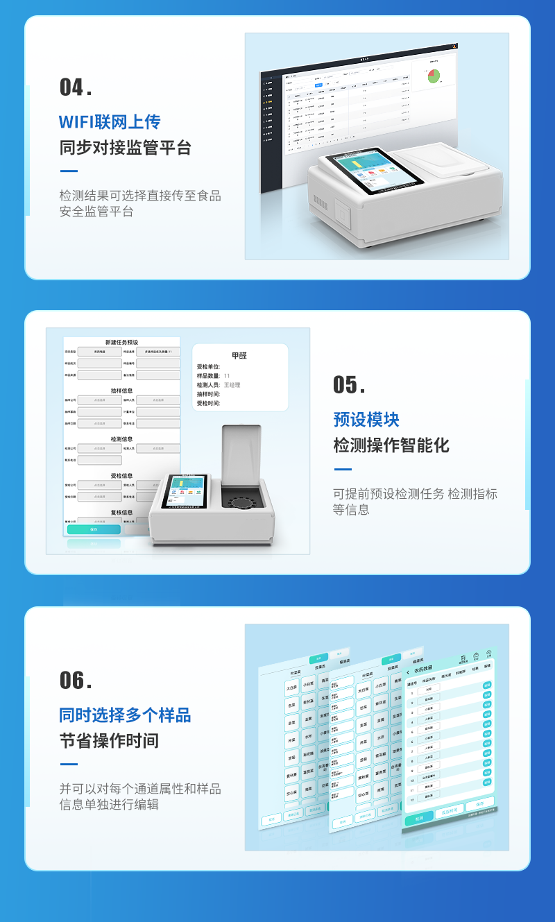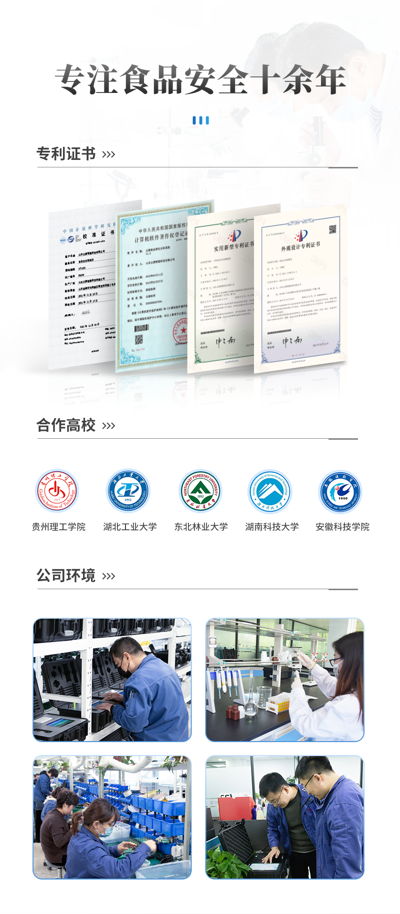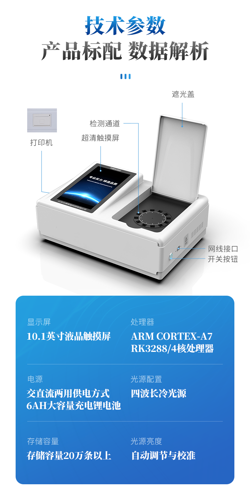 | 儀器采用臺式一體化系統(tǒng)檢測技術,將分光光度模塊、新型農殘檢測模塊、數字化管理模塊、無線通訊模塊高度集成于一體,支持檢測200種食品安全檢測項目,同時預留升級檢測方法。 | 儀器檢測模塊標準化、智能化,可隨意自由組合。檢測箱體內置多個標準檢測單元,檢測模塊可以調整配置。 | 儀器采用全新安卓智能系統(tǒng),主控芯片采用 ARM Cortex-A7,RK3288/4核處理器,10.1寸高清液晶觸摸豎屏,更加**的UI交互界面,運轉快捷;儀器配備無線通信模塊: 4G(APN)通訊模塊、Wifi模塊,藍牙傳輸,同時具有雙USB接口以及RJ45接口能以多種方式實現(xiàn)數據保存和數據傳輸功能。 | 創(chuàng)新檢測模式: | ★檢測通道:≥12通道;采用精密旋轉比色池設計,使用同芯片同光源校準精度,解決不同光源之間的誤差值。1-12通道間誤差0.1%。(**號:ZL202022821055.2) | ★儀器具有自動識別比色皿檢測功能,即:將樣品比色皿放入儀器后,點擊樣品檢測,儀器自動識別比色皿進行通道檢測。 | 進口高精光源: | 高精度進口四波長冷光源,通道配置 410、520、590、630nm 波長光源,一個光源芯片驅動一個光源,誤差極小,每臺設備單獨**校準光源,**比對,同時參照四種不同波段光源全方位覆蓋市面上99%的農殘食品項目檢測。 | 智能化操作系統(tǒng): | 便捷操作系統(tǒng):設備檢測時可在同一檢測界面自動對應相關檢測通道一次性選擇1-12個樣品名稱,無須退出界面,節(jié)省操作時間。 | 數據集成系統(tǒng):設備首頁自動統(tǒng)計檢測數據包含:周檢測數據、月檢測數據,全部檢測總數量,均包含檢測總數,合格數,不合格數,以及相關柱形分析圖,對各項檢測數據清晰掌握,無需電腦查詢,更加快捷直觀。 | 項目預設系統(tǒng):支持添加單個及多個相同或不相同的任務預設,一鍵快速調取,每一個任務分別可以設置不同的樣品、批次、編號、來源、備注、抽樣信息、檢測信息、受檢信息、復核信息等更多信息。無縫鏈接平臺和APP實時查看下發(fā)任務。 | 數據監(jiān)管系統(tǒng):同步對接監(jiān)管平臺,數據可局域網和互聯(lián)網數據上傳,檢測結果可選擇直接傳至食品安全監(jiān)管平臺。集成OSS輸出存儲服務、區(qū)分設備定向管理應用,進行區(qū)域食品安全監(jiān)管及大數據分析處理與數據統(tǒng)計,檢測區(qū)域食品安全長短期動態(tài),達到食品安全問題預估、預警。 | 自定義打印系統(tǒng):內置全新打印系統(tǒng),新創(chuàng)自定義打印方式,可按需靈活設置開啟或關閉:產品合格證(國家農業(yè)部標準要求),二維碼,抽樣信息、檢測信息,受檢信息、復核信息、抽樣日期、檢測日期等信息的打印。 | 系統(tǒng)遠程更新功能:可定向分客戶分儀器更新系統(tǒng),按照不同客戶后期實際需求添加項目,無需機器返廠,即可遠程實時升級全新系統(tǒng),節(jié)省時間成本及避免運輸造成設備損壞。 | 儀器主機采用一體化防水、抗壓、防撞擊、防腐蝕箱體設計,同時配備交直流供電,可連接車載電源,可選配大容量充電鋰電池,滿足現(xiàn)場野外檢測需求。 | 安全證書,放心保障:儀器具有中國計量科學研究院校準證書,**認證。 |