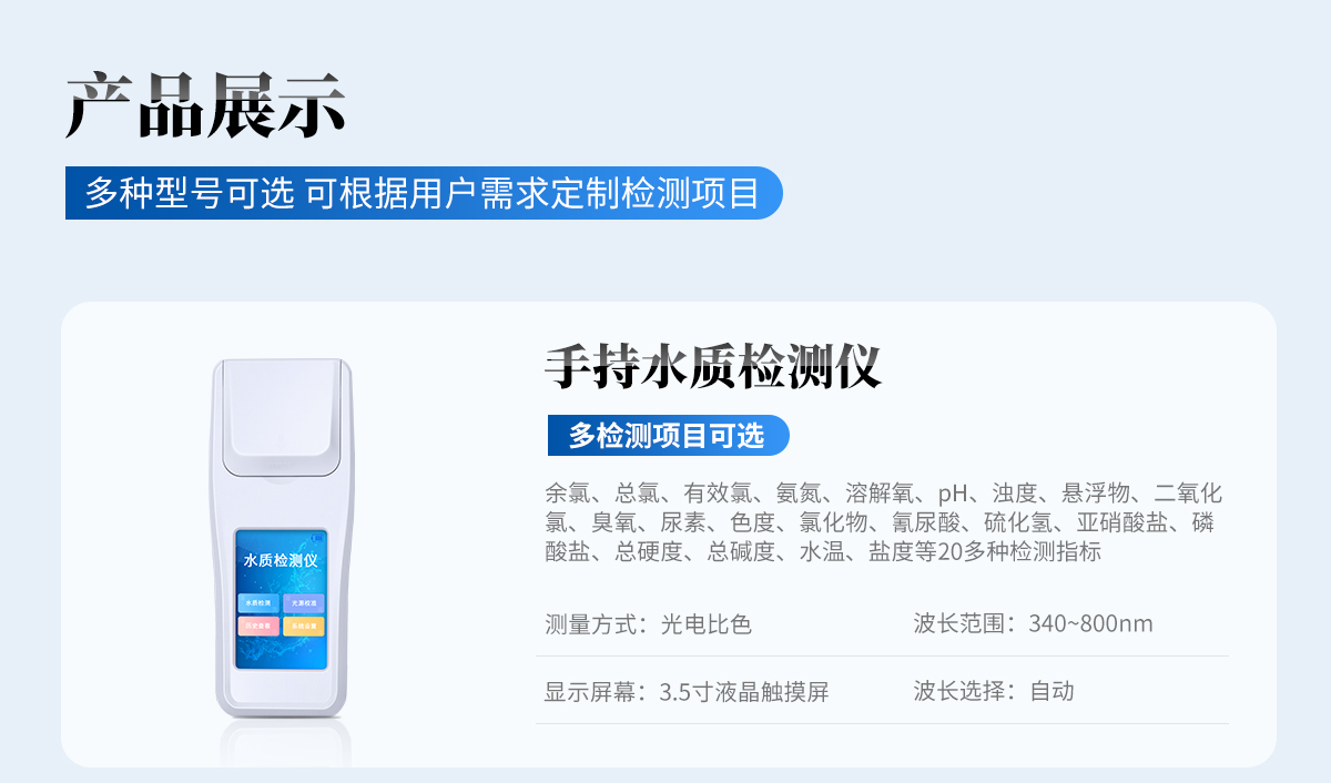 適用于純凈水廠、自來水廠、生活污水處理廠、工業(yè)污水、水產(chǎn)養(yǎng)殖、河流監(jiān)測(cè)、游泳場(chǎng)館、水源保護(hù)、生產(chǎn)監(jiān)測(cè)、科研實(shí)驗(yàn)等。
