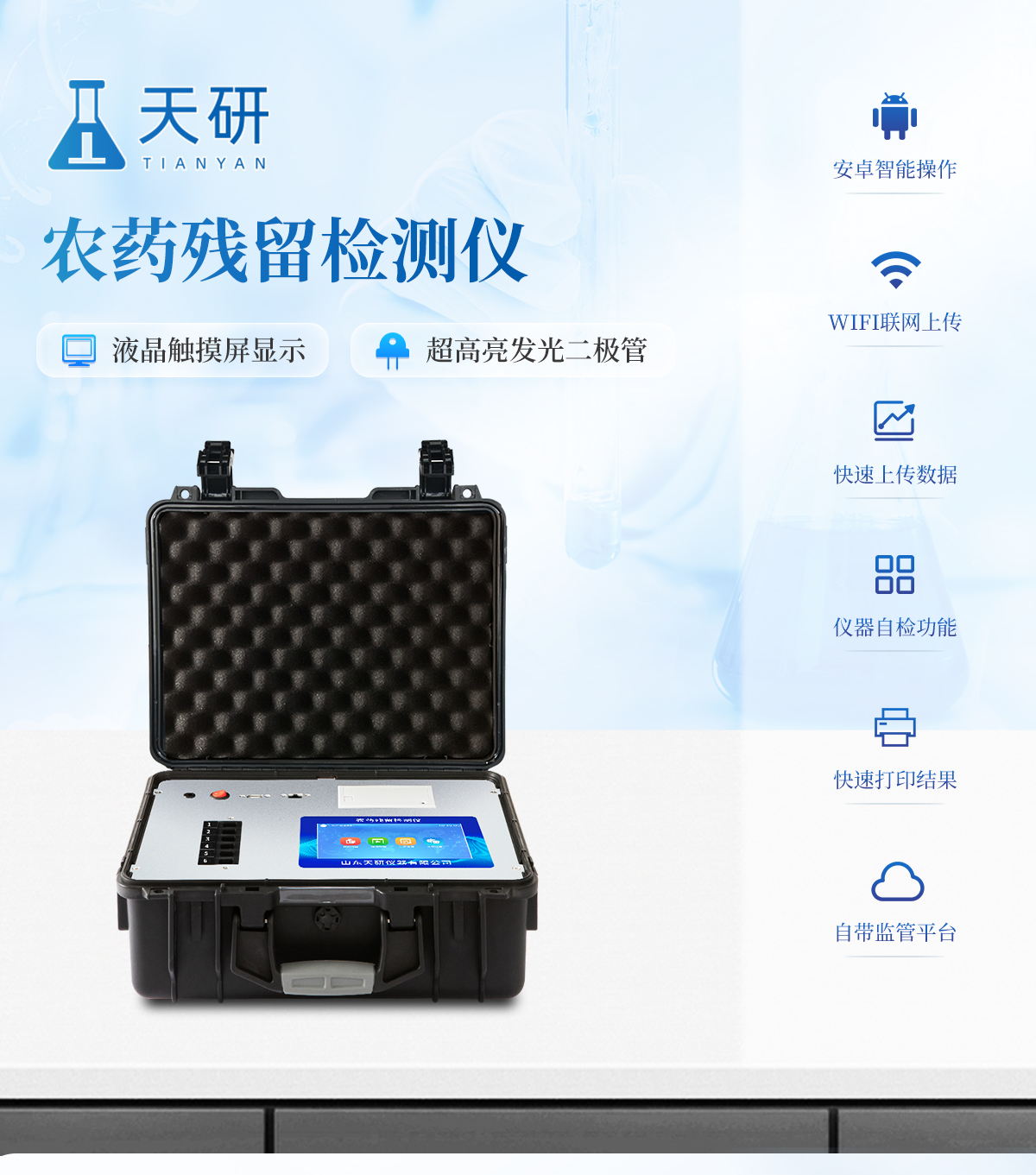 | 機箱采用工業(yè)級ABS工程塑料箱,方便攜帶,穩(wěn)固耐用,便于流動測試。 | 智能操作系統(tǒng),采用更加人性化操作,主控采用多核處理器,主頻1.88Ghz,運轉(zhuǎn)速度更快速,穩(wěn)定性更強。 | 自動判斷樣品是否合格,檢測結(jié)果更加直觀。 | 儀器具有100多種蔬菜名稱菜單庫,分類管理,并可按需添加或刪除蔬菜名,編輯蔬菜名稱,可直接打印出蔬菜名稱。 | 檢測通道:6個檢測通道,可以同時測試多個樣品,循環(huán)檢測,即放即檢,每個樣品由程序控制分別獨立工作,不會互相干擾。 | 儀器具有wifi聯(lián)網(wǎng)功能,可將數(shù)據(jù)快速上傳電腦,進(jìn)行數(shù)據(jù)管理與統(tǒng)計,4G信號GPRS遠(yuǎn)傳功能,可插手機卡實現(xiàn)數(shù)據(jù)遠(yuǎn)傳平臺,。 | 顯示方式:7英寸高靈敏真彩觸摸屏顯示,人性化中文操作界面,讀數(shù)直觀、簡單。 | 打印機采用串口5v打印,可選擇手動打印或者自動打印,三分鐘出打印結(jié)果,打印格式為檢測人姓名、吸光度差值、檢測時間、檢測機構(gòu)、樣品名稱及結(jié)果判定。 | 光源采用進(jìn)口超高亮發(fā)光二極管,具有低功耗、高精度、穩(wěn)定性強、光源可控可以關(guān)掉不使用的光源,響應(yīng)速度快等優(yōu)點。 | 智能恒流穩(wěn)壓,光強自動校準(zhǔn),長時間連續(xù)工作光源無溫漂現(xiàn)象。 | 采用USB2.0接口設(shè)計,方便數(shù)據(jù)的存貯和移動,并可隨時與計算機直接相連,并且可用計算機控制儀器。實現(xiàn)數(shù)據(jù)查詢、瀏覽、分析、統(tǒng)計、打印等。 | 智能化程度高,儀器具有自檢功能:具有開機自檢和調(diào)零功能,具有自動檢測重復(fù)性功能 | 儀器具有自身保護(hù)功能,可設(shè)置用戶名及密碼,防止非工作人員操作等。 | 采用DC12v直流供電,安全系統(tǒng)更高,并且配備6A鋰電池充電器。 | 儀器具有重新校準(zhǔn)、鎖定、恢復(fù)出廠設(shè)置功能。 |