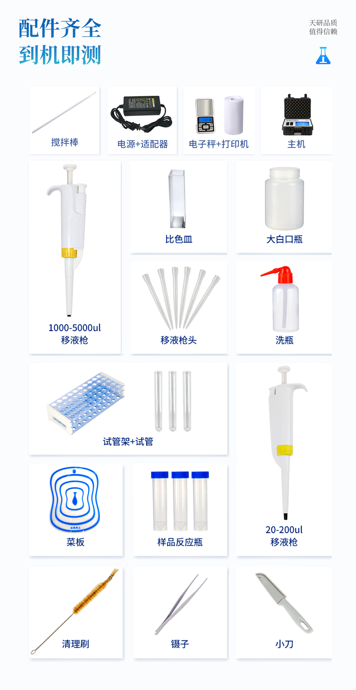 | 機(jī)箱采用工業(yè)級(jí)ABS工程塑料箱,方便攜帶,穩(wěn)固耐用,便于流動(dòng)測(cè)試。 | 智能操作系統(tǒng),采用更加人性化操作,主控采用多核處理器,主頻1.88Ghz,運(yùn)轉(zhuǎn)速度更快速,穩(wěn)定性更強(qiáng)。 | 自動(dòng)判斷樣品是否合格,檢測(cè)結(jié)果更加直觀。 | 儀器具有100多種蔬菜名稱菜單庫(kù),分類管理,并可按需添加或刪除蔬菜名,編輯蔬菜名稱,可直接打印出蔬菜名稱。 | 檢測(cè)通道:18個(gè)檢測(cè)通道,可以同時(shí)測(cè)試多個(gè)樣品,循環(huán)檢測(cè),即放即檢,每個(gè)樣品由程序控制分別獨(dú)立工作,不會(huì)互相干擾。 | 儀器具有wifi聯(lián)網(wǎng)功能,可將數(shù)據(jù)快速上傳電腦,進(jìn)行數(shù)據(jù)管理與統(tǒng)計(jì),4G信號(hào)GPRS遠(yuǎn)傳功能,可插手機(jī)卡實(shí)現(xiàn)數(shù)據(jù)遠(yuǎn)傳平臺(tái),。 | 顯示方式:7英寸高靈敏真彩觸摸屏顯示,人性化中文操作界面,讀數(shù)直觀、簡(jiǎn)單。 | 打印機(jī)采用串口5v打印,可選擇手動(dòng)打印或者自動(dòng)打印,三分鐘出打印結(jié)果,打印格式為檢測(cè)人姓名、吸光度差值、檢測(cè)時(shí)間、檢測(cè)機(jī)構(gòu)、樣品名稱及結(jié)果判定。 | 光源采用進(jìn)口超高亮發(fā)光二極管,具有低功耗、高精度、穩(wěn)定性強(qiáng)、光源可控可以關(guān)掉不使用的光源,響應(yīng)速度快等優(yōu)點(diǎn)。 | 智能恒流穩(wěn)壓,光強(qiáng)自動(dòng)校準(zhǔn),長(zhǎng)時(shí)間連續(xù)工作光源無(wú)溫漂現(xiàn)象。 | 采用USB2.0接口設(shè)計(jì),方便數(shù)據(jù)的存貯和移動(dòng),并可隨時(shí)與計(jì)算機(jī)直接相連,并且可用計(jì)算機(jī)控制儀器。實(shí)現(xiàn)數(shù)據(jù)查詢、瀏覽、分析、統(tǒng)計(jì)、打印等。 | 智能化程度高,儀器具有自檢功能:具有開(kāi)機(jī)自檢和調(diào)零功能,具有自動(dòng)檢測(cè)重復(fù)性功能 | 儀器具有自身保護(hù)功能,可設(shè)置用戶名及密碼,防止非工作人員操作等。 | 采用DC12v直流供電,安全系統(tǒng)更高,并且配備6A鋰電池充電器。 | 儀器具有重新校準(zhǔn)、鎖定、恢復(fù)出廠設(shè)置功能。 |