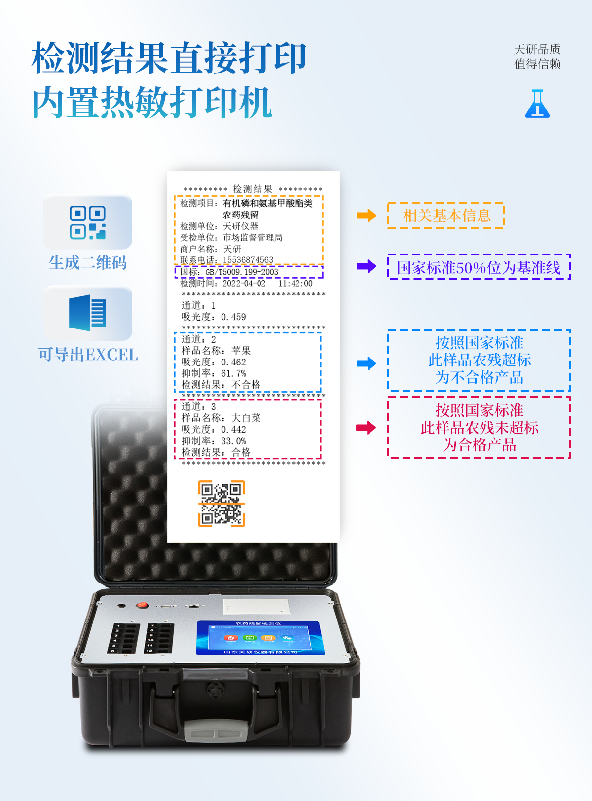 | 隨著人民生活水平的不斷提升,市場對茶葉的把控愈加嚴格。針對現(xiàn)狀,我司專門研發(fā)生產(chǎn)--茶葉專用的農(nóng)藥殘留速測儀;定位茶農(nóng)、茶商、茶葉企業(yè)使用。 此外還可用于果蔬茶生產(chǎn)基地和農(nóng)貿(mào)批發(fā)銷售市場現(xiàn)場檢測,餐館、學(xué)校、食堂、家庭果蔬加工前的安全速測等。 | 檢測通道: 5個檢測通道,可以同時測試多個樣品,每個樣品由程序控制分別獨立工作,不會互相干擾。 | 顯示方式:≥5英寸液晶觸摸屏顯示,人性化中文操作界面,讀數(shù)直觀、簡單。 | 配備嵌入式高速熱敏打印機,可選擇手動打印或者自動打印,三分鐘出打印結(jié)果。 | 光源采用進口超高亮發(fā)光二極管,具有低功耗、穩(wěn)定性強、高靈敏度,高檢測精度,高重復(fù)性精度,光源可控、響應(yīng)速度快等優(yōu)點。 | 采用標準USB接口設(shè)計,免驅(qū)動安裝,方便數(shù)據(jù)的存貯和移動,并可隨時與計算機直接相連,并且可用計算機控制儀器。實現(xiàn)數(shù)據(jù)查詢、瀏覽、分析、統(tǒng)計、打印等。 | 智能化程度高,儀器具有自檢功能:具有開機自檢和調(diào)零功能,具有自動檢測重復(fù)性功能 | 內(nèi)置強大的數(shù)據(jù)庫,可在儀器上直接選擇樣品名稱、檢測指標、送檢單位等信息,也可在儀器上直接編輯錄入樣品名稱、檢測指標、送檢單位等信息并保存進樣品數(shù)據(jù)庫。 | 支持Wifi網(wǎng)絡(luò),數(shù)據(jù)可局域網(wǎng)和互聯(lián)網(wǎng)數(shù)據(jù)上傳,檢測結(jié)果直接傳至食品安全監(jiān)管平臺。進行區(qū)域食品安全監(jiān)管及大數(shù)據(jù)分析處理,檢測區(qū)域食品安全長短期動態(tài),達到食品安全問題預(yù)估、預(yù)警 |