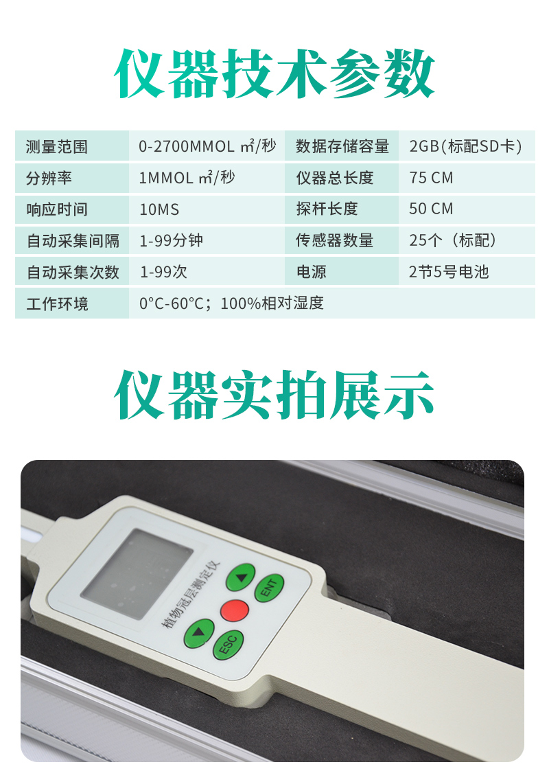 整套是由數(shù)據(jù)采集器和探桿兩部分組成。探桿上包括18個獨立的傳感器,可同時測量上、下冠層的PAR值。探桿長度:50 cm