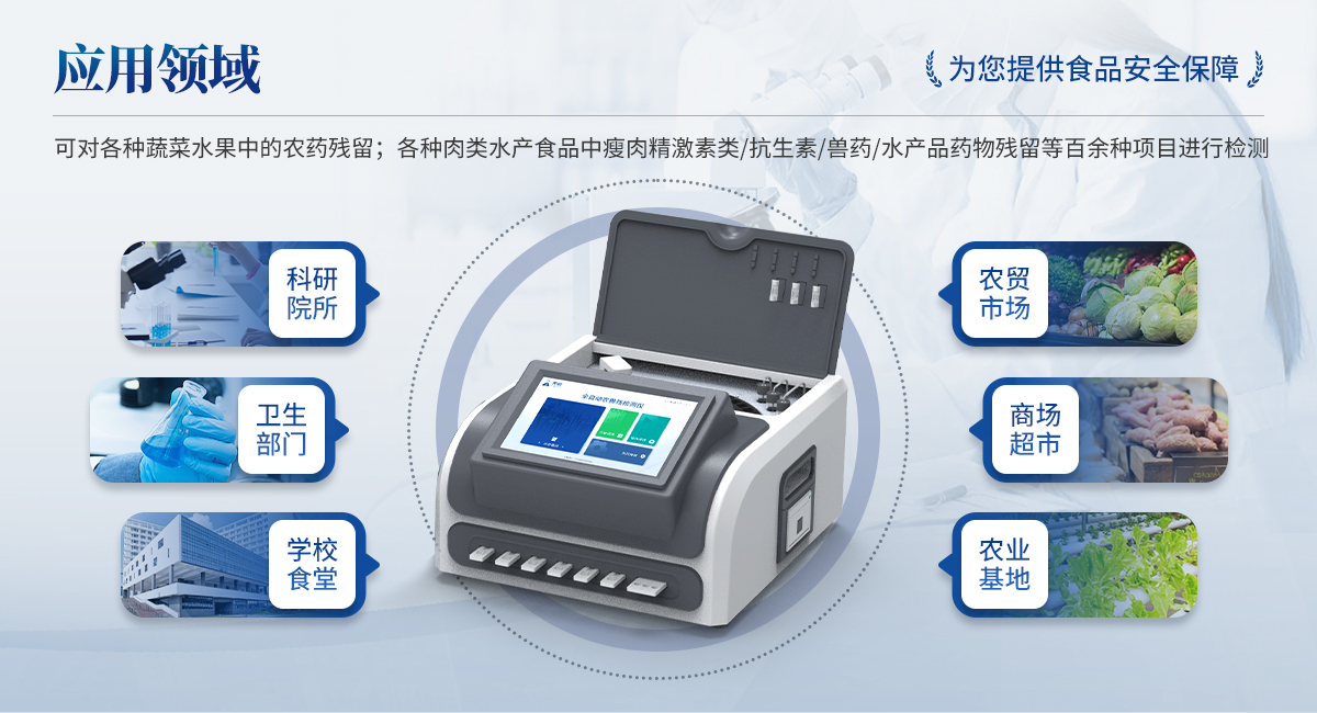 全自動農(nóng)獸藥殘留檢測儀可對各種蔬菜水果中有機(jī)磷和氨基甲酸酯類農(nóng)藥殘留;各種肉類水產(chǎn)食品中瘦肉精激素類殘留,抗生素殘留,獸藥殘留,水產(chǎn)品藥物殘留等百余種項(xiàng)目進(jìn)行快速檢測。該設(shè)備廣泛應(yīng)用于蔬菜批發(fā)市場、超市、商場、食藥監(jiān)等部門的蔬菜和水果中的農(nóng)藥殘留檢測。