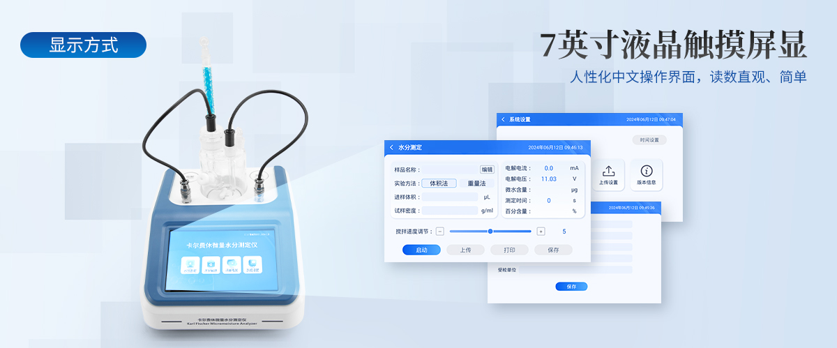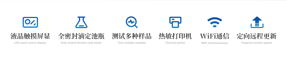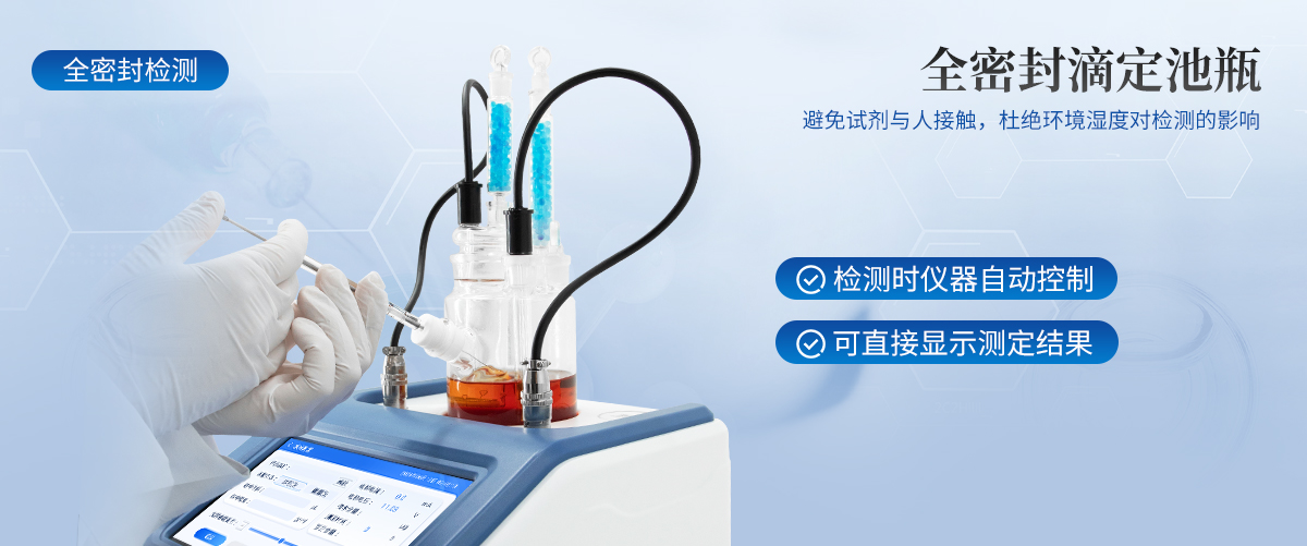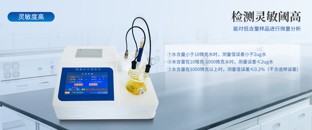 | 微量水分測定儀根據(jù)卡爾-菲休滴定原理,采用**的微機電路,測定性質(zhì)不同的液體、固體中微量水分的含量。對于不溶于試劑的固體,以及與試劑起化學(xué)反應(yīng)的或容易污染電極的物質(zhì),可配用相應(yīng)的固體、液體進樣器,進行間接測定。 | 該儀器具有測定精度高、分析速度快、使用范圍廣、穩(wěn)定可靠、操作簡單等優(yōu)點。廣泛用于電力、石油、化工、農(nóng)藥、醫(yī)藥等行業(yè)。樣品測定過程由儀器自動控制,攪拌、測定60秒左右自動完成,直接顯示測定結(jié)果;全密封滴定池瓶,避免試劑與人接觸,也避免環(huán)境濕度的影響; |