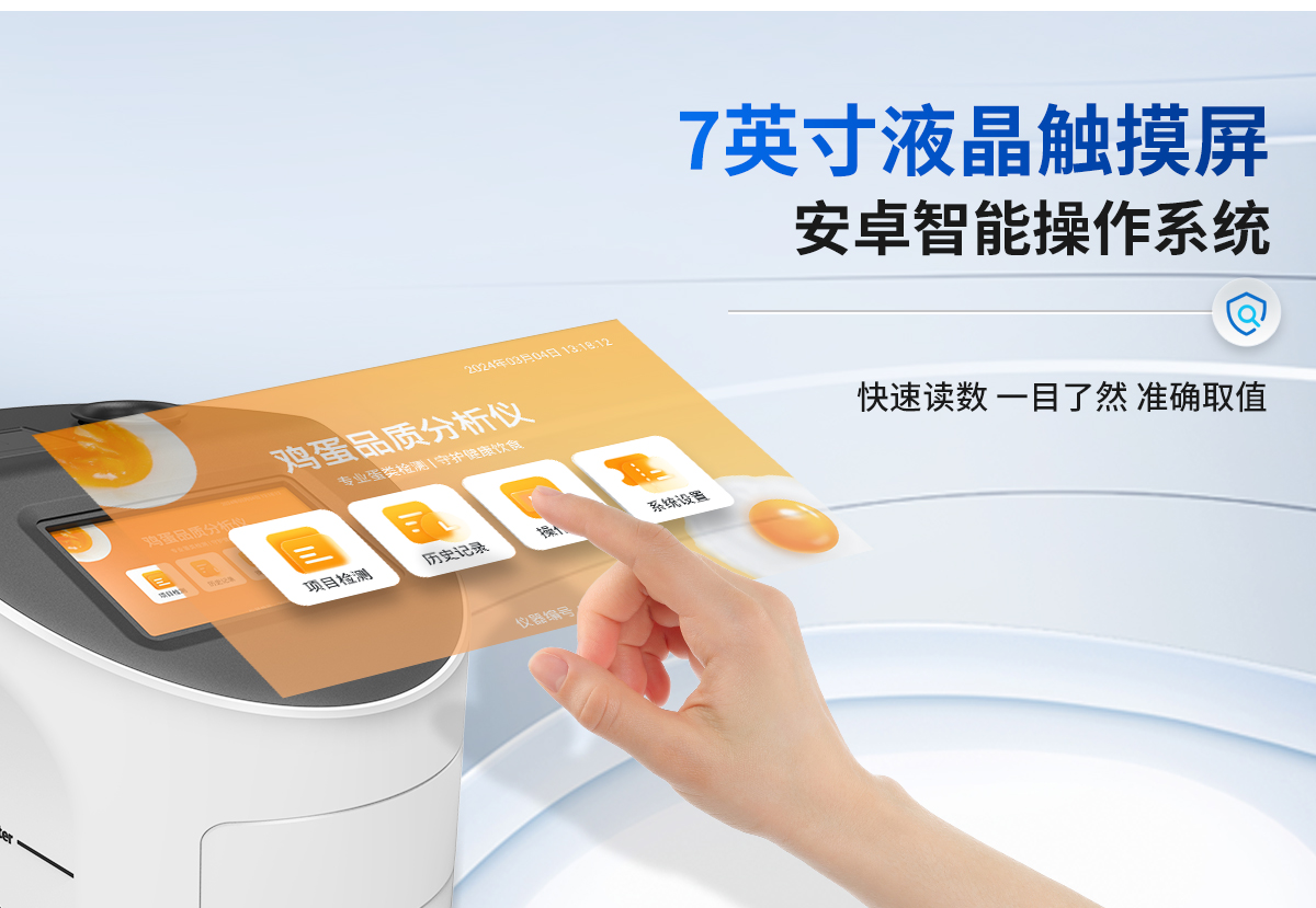| 1.儀器采用7英寸液晶觸摸屏,搭配運(yùn)行安卓智能操作系統(tǒng),主控芯片采用ARM Cortex-A7,RK3288/4核處理器,主頻1.88Ghz,操作方便,性能更強(qiáng)。 | 2.儀器采用智能化控制,可一鍵自動(dòng)測(cè)量蛋重、蛋白高度、新鮮度(哈夫單位)、蛋黃高度、蛋殼厚度。 | 3.高精度數(shù)字傳感器,測(cè)量結(jié)果精度高,穩(wěn)定性好。 | 4.創(chuàng)新采用高精超聲波傳感器測(cè)試蛋白高度,精密傳感器測(cè)試蛋黃顏色,無(wú)需直接接觸蛋液,減少誤差存在。 | 5.儀器測(cè)試性能穩(wěn)定,不受操作人員的能力影響,方便簡(jiǎn)單。 | 6.可一鍵自動(dòng)測(cè)量哈夫單位、蛋重、蛋白高度、蛋黃高度和蛋殼厚度,把測(cè)試時(shí)間縮短到 17 秒。 | 7.儀器可本機(jī)存儲(chǔ)數(shù)據(jù),可連接USB端口將數(shù)據(jù)導(dǎo)出存儲(chǔ)。另外,儀器自帶數(shù)據(jù)上傳模塊,具有WIFI聯(lián)網(wǎng)上傳、RJ45網(wǎng)線連接功能,數(shù)據(jù)可實(shí)現(xiàn)局域網(wǎng)和互聯(lián)網(wǎng)數(shù)據(jù)上傳,檢測(cè)結(jié)果可選擇直接傳至數(shù)據(jù)平臺(tái),進(jìn)行大數(shù)據(jù)分析處理與數(shù)據(jù)統(tǒng)計(jì),達(dá)到長(zhǎng)期分析監(jiān)測(cè)的目的。 | 8.打印系統(tǒng):內(nèi)置全新打印機(jī),可以打印項(xiàng)目名稱、二維碼、抽樣信息、檢測(cè)信息、受檢信息、復(fù)核信息、抽樣日期、檢測(cè)日期等信息。 | 9.供電模式:儀器交直流兩用,直流12V供電(標(biāo)配),可連接車載電源,亦可選配6ah大容量充電鋰電池,方便戶外流動(dòng)測(cè)試。 | 10.儀器具有重新校準(zhǔn)、鎖定功能。 | 11.檢測(cè)指標(biāo): | (1)蛋白高度測(cè)量范圍:0.0~40.0mm,精度:0.1mm ; | (2)蛋重測(cè)量范圍:0~250g,精度:0.1g ; | (3) Haugh unit 值范圍:0~130HU; | (4)**等級(jí):AA:≥72,A:71~60,B:59~31,C:≤30; | 12.外觀尺寸:340*290*238mm(長(zhǎng)*寬*高),儀器重量:5.05kg。 |