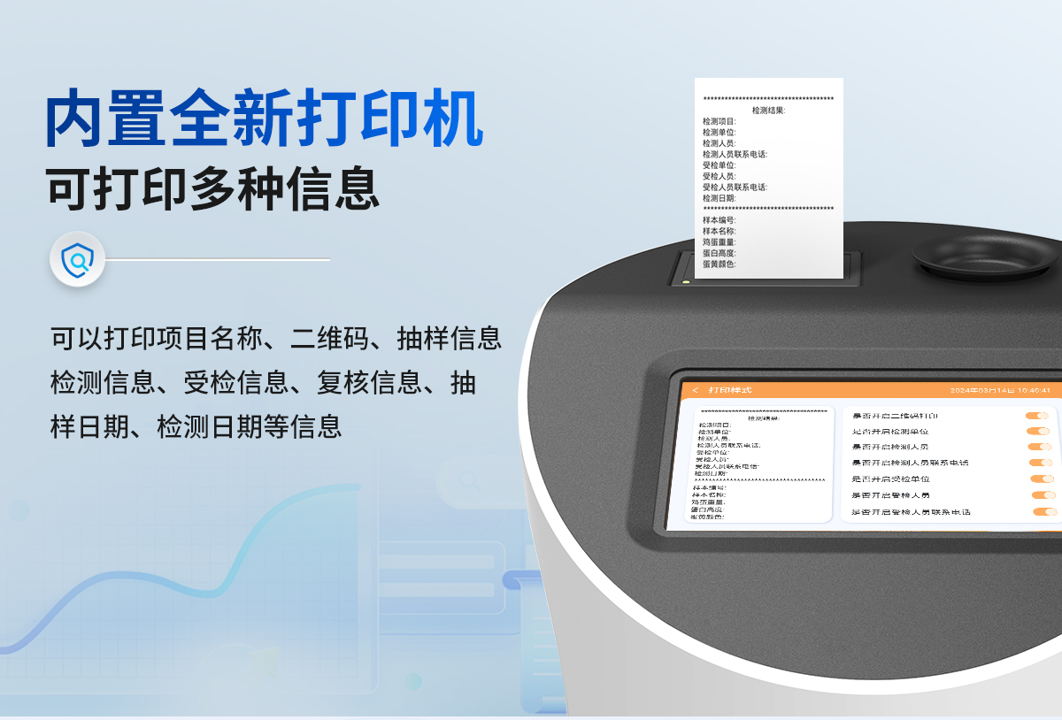 隨著消費(fèi)者對(duì)食品安全問(wèn)題的日益關(guān)注,雞蛋品質(zhì)檢測(cè)成為了保障雞蛋質(zhì)量、維護(hù)消費(fèi)者健康權(quán)益的重要手段。我司生產(chǎn)的雞蛋品質(zhì)檢測(cè)儀可通過(guò)專業(yè)的檢測(cè)項(xiàng)目和方法,進(jìn)行雞蛋的品質(zhì)檢測(cè)和分析。