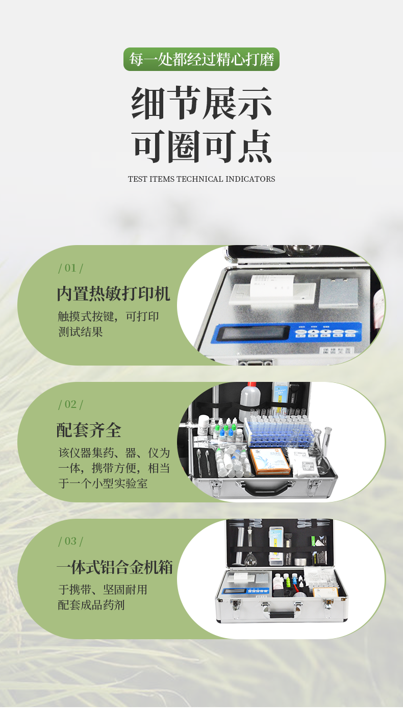 | 《機(jī)箱/藥劑一體式鋁合金機(jī)箱》設(shè)計(jì),便于攜帶、堅(jiān)固耐用,配套成品藥劑。 | 微電腦控制,數(shù)字化線路、程序化設(shè)計(jì),液晶顯示,交直流兩用,可野外流動(dòng)測(cè)試,大程度降低操作者的失誤和勞動(dòng)強(qiáng)度。 | 分辨率:0.001,觸摸式按鍵,內(nèi)置熱敏打印機(jī),可打印測(cè)試結(jié)果。 | 可檢測(cè)土壤及化肥、有機(jī)肥、植株中的速效氮、有效磷、速效鉀、全氮、全磷、全鉀、有機(jī)質(zhì)含量,土壤酸堿度,含鹽量(擴(kuò)展)。 | 土壤養(yǎng)分速測(cè)儀采用高亮度 LED 燈作為光源, 硅半導(dǎo)體作為信號(hào)接收系統(tǒng), 壽命長(zhǎng)達(dá)10萬小時(shí)級(jí)別。光源穩(wěn)定,一致性好。 | 比色槽部分采用單通道、雙光路設(shè)計(jì),無機(jī)械位移及磨損,光路測(cè)試定位**,保證測(cè)定結(jié)果精度。 |
