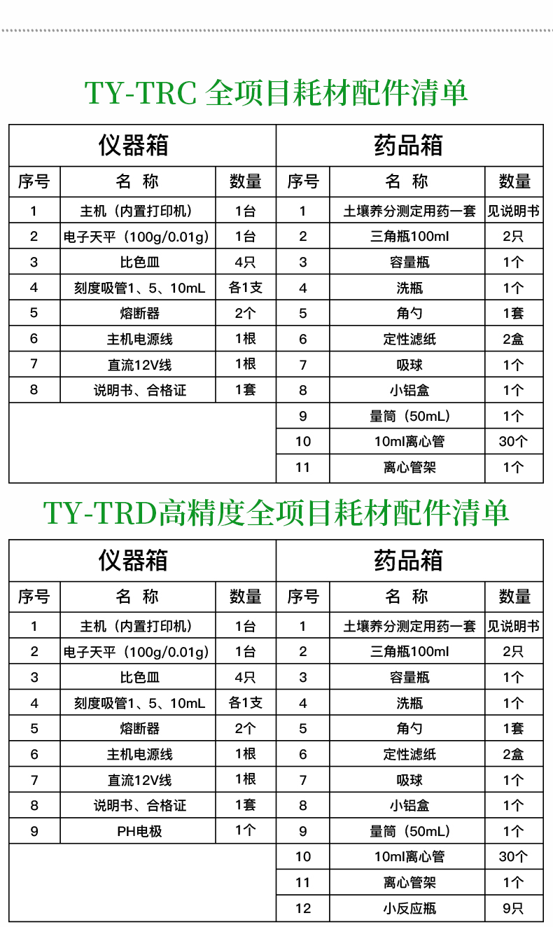 | 儀器整機(jī)質(zhì)保一年(主機(jī)質(zhì)保五年),終身免費(fèi)維修服務(wù),免費(fèi)郵寄儀器、免費(fèi)培訓(xùn)。 | 終身免費(fèi)提供土肥等農(nóng)業(yè)相關(guān)技術(shù)支持! | 標(biāo)準(zhǔn)配置清單(一個(gè)鋁合金箱子): |