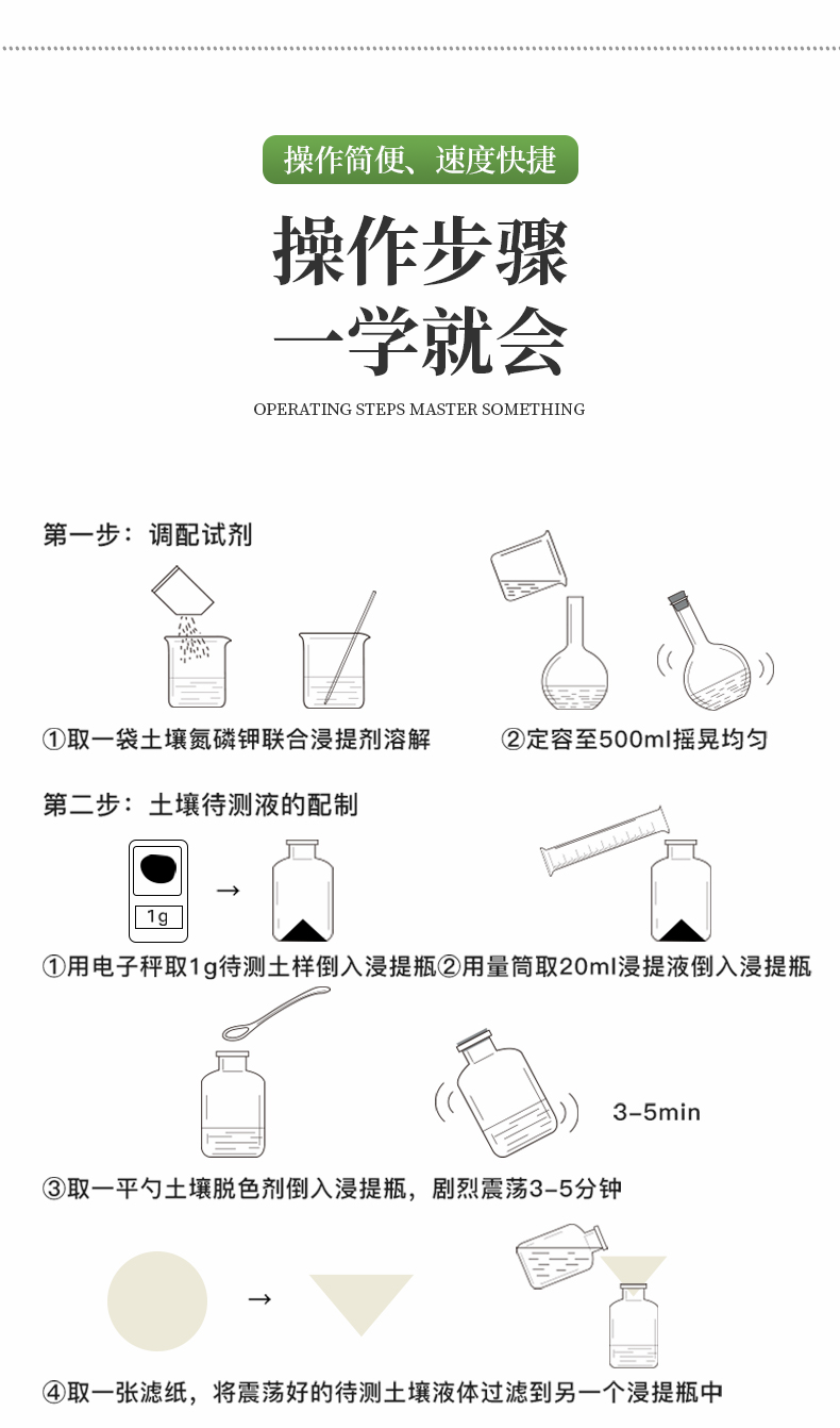 | 土壤養(yǎng)分:● 銨態(tài)氮、速效磷、速效鉀、水份、有機(jī)質(zhì)、酸堿度(pH試紙法)等項(xiàng); | 肥料養(yǎng)分:● 單質(zhì)化肥中的氮、磷、鉀; ● 復(fù)(混)合肥及尿素中的銨態(tài)氮、磷、鉀; ● 有機(jī)肥中速效氮、速效磷、速效鉀、全氮、全磷、全鉀、pH、有機(jī)質(zhì)等。 |