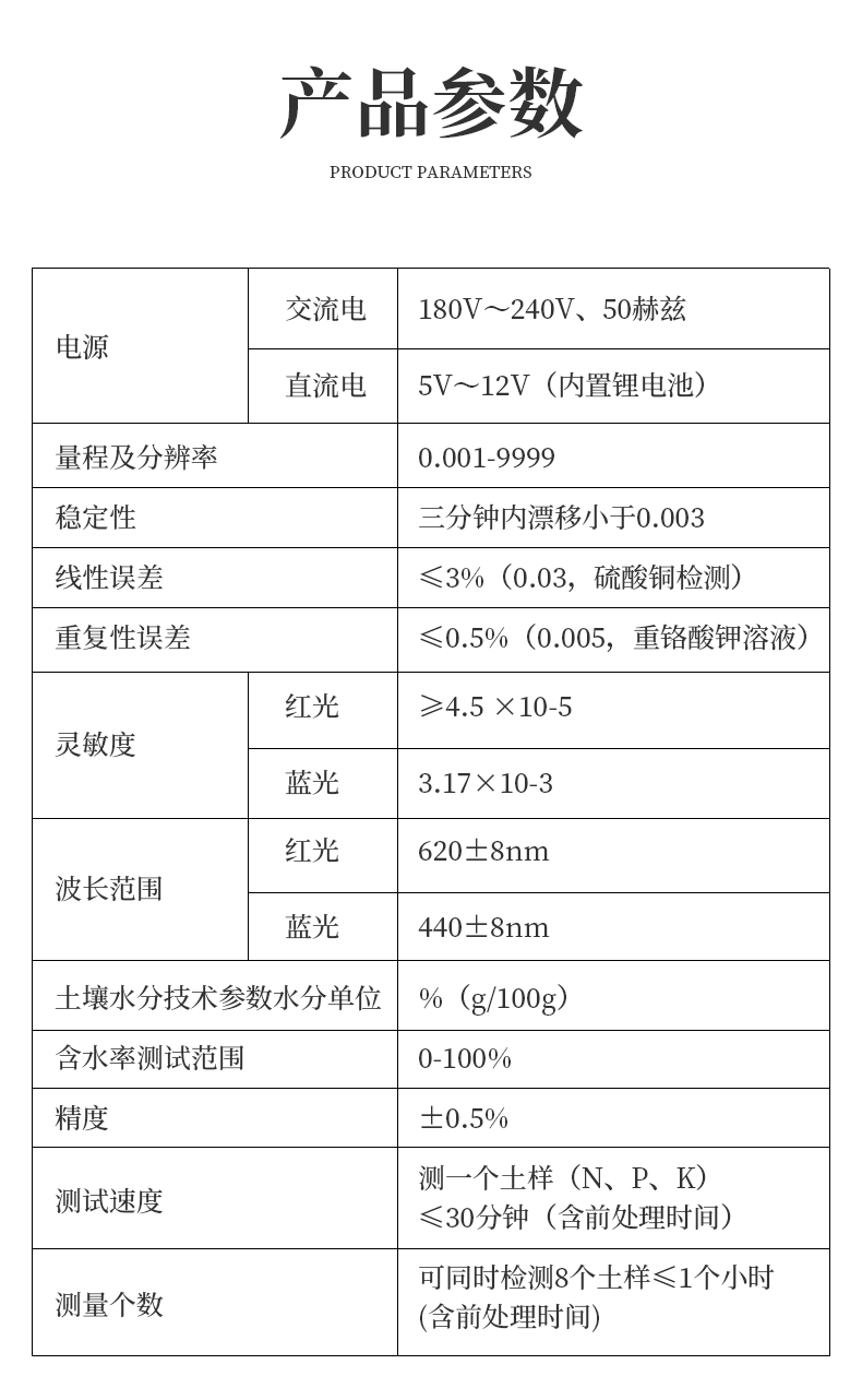 | 電源:交流 220±22V 直流 12V+5V(可用車載電源也可選擇儀器內(nèi)置鋰電池) | 功率: ≤5W | 量程及分辨率:0.001-9999 | 重復(fù)性誤差: ≤0.3%(0.003,重鉻酸鉀溶液) | 儀器穩(wěn)定性:三分鐘內(nèi)漂移小于0.2%(0.002,透光度測(cè)量)。儀器開(kāi)機(jī)預(yù)熱5分鐘后,兩分鐘內(nèi)顯示數(shù)字無(wú)漂移(透光度測(cè)量),五分鐘內(nèi)數(shù)字漂移不超過(guò)0.3%(透光度測(cè)量);二十分鐘內(nèi)數(shù)字漂移不超過(guò)0.5%(透光度測(cè)量)、0.001(吸光度測(cè)量);三十分鐘內(nèi)數(shù)字漂移不超過(guò)0.7%(透光度測(cè)量)、0.002(吸光度測(cè)量)。 | 線性誤差: ≤1%(0.01,硫酸銅檢測(cè)) | 靈敏度:紅光≥4.5 ×10-5 藍(lán)光≥3.17×10-3 綠光≥2.35×10-3 橙光≥2.13×10-3 | 波長(zhǎng)范圍 :紅光:680±2nm; 藍(lán)光:420±2nm;綠光:510±2nm;橙光:590±4nm | PH值(酸堿度): (1)測(cè)試范圍:1~14 (2)精度:0.1 (3)誤差:±0.1(擴(kuò)展) | 含鹽量(電導(dǎo)):(1)測(cè)試范圍:0.01%~1.00% (2)相對(duì)誤差:±5% | 土壤水分技術(shù)參數(shù)水分單位:﹪(g/100g);含水率測(cè)試范圍:0-100﹪;誤差小于0.5% | 土壤中速效N、P、K三種養(yǎng)分一次性同時(shí)浸提測(cè)定、科學(xué)指導(dǎo)施肥量 | 肥料中氮(N)、磷(P)、鉀(K)等養(yǎng)分同時(shí)、快速、準(zhǔn)確檢測(cè) | 測(cè)試速度:測(cè)一個(gè)土樣(N、P、K)≤30分鐘(含前處理時(shí)間,不需用戶提供任何附件) | 同時(shí)測(cè)8個(gè)土樣≤1小時(shí)(含前處理時(shí)間) | 數(shù)據(jù)打?。簝?nèi)置**一鍵式熱敏打印機(jī) |