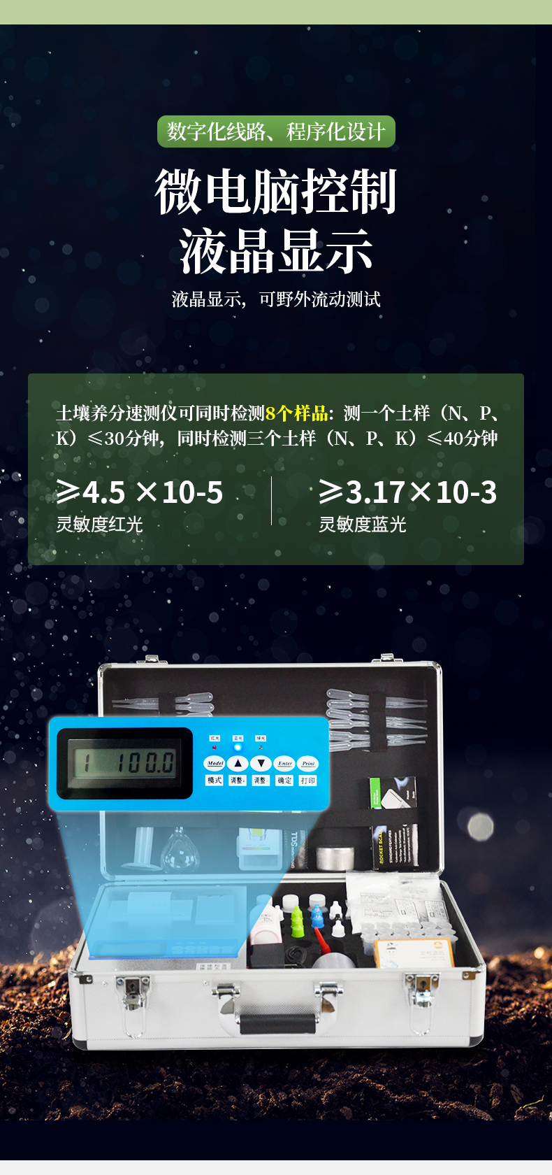 | 儀器整機(jī)質(zhì)保五年,終身免費(fèi)維修服務(wù),免費(fèi)郵寄儀器、免費(fèi)培訓(xùn)、免費(fèi)提供檢測試劑。 | 終身免費(fèi)提供土肥等農(nóng)業(yè)相關(guān)技術(shù)支持! | 配置清單(兩個(gè)鋁合金箱子): |