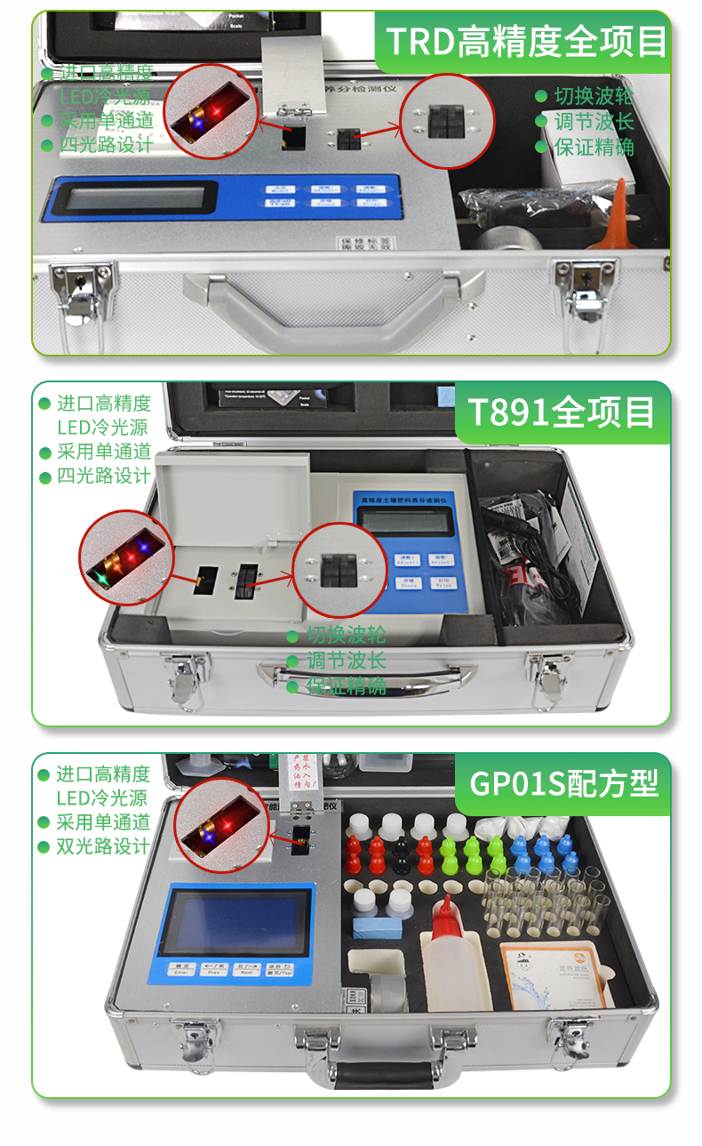 | 肥料養(yǎng)分專用快速檢測儀配套齊全:該儀器集藥、器、儀為一體,攜帶方便,相當(dāng)于一個(gè)小型實(shí)驗(yàn)室。適于農(nóng)業(yè)服務(wù)部門或農(nóng)資經(jīng)銷商、肥料廠商測土施肥和鑒別肥料真假。 | 操作簡便、速度快捷,成品藥劑開瓶即用,無須配置。 | 性能可靠:工作穩(wěn)定性優(yōu)于國家標(biāo)準(zhǔn)JJG179-90指標(biāo)的6倍,重復(fù)性達(dá)到光柵型分光光度計(jì)指標(biāo)水平。 |