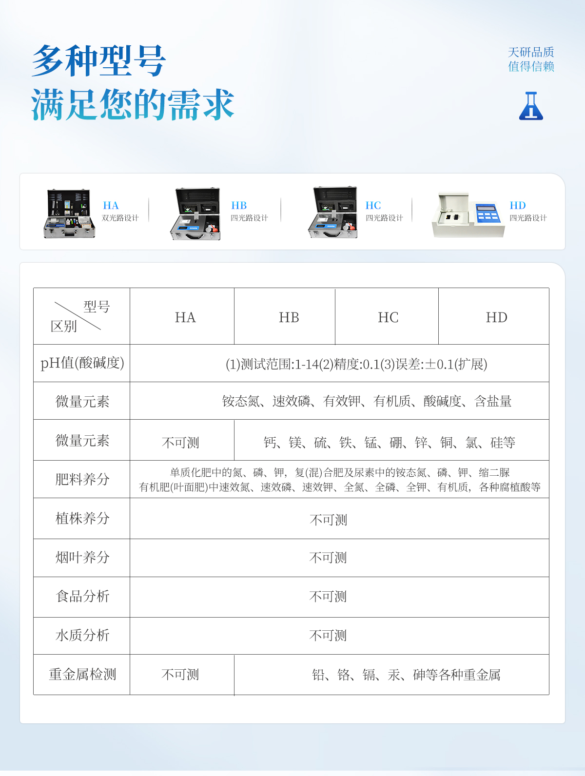| 全國獨家《機箱/藥劑一體式鋁合金機箱》**設(shè)計,便于攜帶、堅固耐用,配套檢測方法及成品藥劑。 | 微電腦控制,數(shù)字化線路、程序化設(shè)計,液晶顯示,交直流兩用,測試數(shù)據(jù)可存儲查詢,可野外流動測試,**程度降低操作者的失誤和勞動強度。 | 分辨率:0.001,觸摸式按鍵,內(nèi)置新一代熱敏打印機,可打印測試結(jié)果。 | 復合肥養(yǎng)分含量檢測儀可檢測化肥、有機肥(含葉面肥、水溶肥、噴施肥)生物肥等中的速效氮、速效磷、有效鉀、全氮、全磷、全鉀、有機質(zhì)、酸堿度,鈣、鎂、硫、鐵、錳、硼、鋅、銅、氯、硅、鉬等各種中微量元素以及鉛、鉻、鎘、汞、砷、鎳、鋁、氟、鈦、硒等各種重金屬含量。 | 采用高亮LED光源,濾光式處理,保證光源波長穩(wěn)定, 硅半導體作為信號接收系統(tǒng), 壽命長達10萬小時級別。光源穩(wěn)定,重現(xiàn)性好,準確度高。 | 比色槽部分采用單通道設(shè)計,無機械位移及磨損,光路測試定位**,保證測定結(jié)果精度。 |