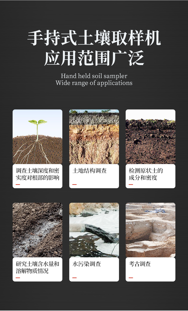 | 旋轉(zhuǎn)式,上下沒有擾動,不會破壞土壤剖面結(jié)構(gòu) | 采樣量大,插銷連接,易于拆卸。 | 鉆頭帶有鋸齒,通過沖擊錘鉆入土壤,入土容易。 | 筒型鉆頭獨特可拆卸裁口設計,取樣容易。 | 樣品處于比較寬松的柱狀圓筒中,取出十分容易 | 狀土壤很難被壓縮(保持原狀) | 采集一個樣本就可以研究整個土壤剖面情況 | 比開挖一個采樣坑要節(jié)約時間和減少樣本破壞 | 可有效地用于所有類型的土壤 |