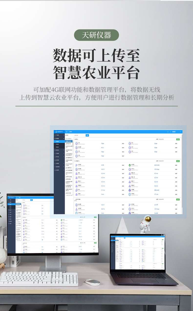 | 儀器可加配4G聯(lián)網(wǎng)功和能數(shù)據(jù)管理平臺,將本機存儲的被測點環(huán)境因子測量歷史數(shù)據(jù)無線上傳到智慧云農業(yè)平臺,方便用戶進行數(shù)據(jù)管理和長期分析。 | 本機體積小巧、美觀,操作簡單方便,性能可靠,野外攜帶極為方便。主機連接傳感器后可以手動存儲記錄也可通過主機任意設置采樣間隔,自動存儲記錄數(shù)據(jù)。 | 大屏幕彩色液晶顯示屏,全程跟蹤記錄各個被測環(huán)境因子的數(shù)值、組數(shù)、低電壓示警,主機內置大容量存儲器,可儲存三十萬條數(shù)據(jù),具有斷電數(shù)據(jù)自動存儲保護功能。 | 各個傳感器插入主機后,主機具有自動識別功能,傳感器一致性好,可按需求自行組合傳感器,不同參數(shù)的傳感器接口可以互相轉換,對測量精度沒有影響。 | 儀器具有多通道自動檢測擴展功能,可以實現(xiàn)多個傳感器同時接入的同步檢測。 | 上位機軟件功能強大,隨時可以通過USB接口將記錄中的數(shù)據(jù)導出到計算機上,并可以存儲為EXCE表格文件,生成數(shù)據(jù)曲線,以供其它分析軟件進一步進行數(shù)據(jù)處理。具有設置超限區(qū)域著色功能,超限數(shù)據(jù)變色預警,可作為環(huán)境評價的一個依據(jù)。 |