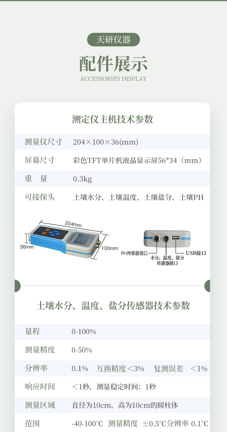 | 土壤水分:(土壤容積含水量:) 單位:%(m3/m3);.測試靈敏度:±0.01 %(m3/m3);.量程:0-100%(m3/m3); 測量精度:0-50%(m3/m3)范圍內)±2%(m3/m3);50-100%(m3/m3)范圍內)±3%(m3/m3); 分辨率:0.1% 互換精度:<3% 復測誤差:<1% 響應時間:<1秒 測量穩(wěn)定時間:1秒 測量區(qū)域:直徑為10cm、高為10cm的圓柱體 | 土壤溫度: 范圍:-40-120℃ 測量精度:±0.2℃ 分辨率:±0.1℃ 互換誤差:<0.2℃ 響應時間:<100mS 穩(wěn)定時間:<1秒 | 土壤鹽分:
