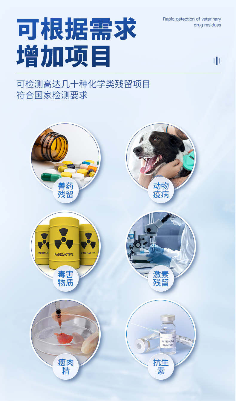 | 瘦肉精激素類(獸藥):鹽酸克倫特羅、沙丁胺醇、萊克多巴胺、己烯雌酚、喹乙醇等 | 抗生素殘留類(獸藥):四環(huán)素類、硝基呋喃類、磺胺類、沙星類、喹諾酮類、慶大霉素、鏈霉素、阿莫西林、紅霉素等 | 水產(chǎn)品安全類:孔雀石綠、氯霉素、呋喃妥因代謝、呋喃西林代謝、呋喃它酮代謝、呋喃唑酮代謝等 | 以及病害肉及肉類新鮮度的擴展檢測。 |