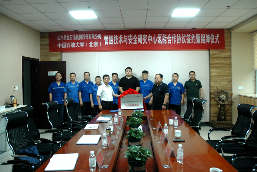 2024年7月4日上午,山東墨龍與中國石油大學(北京)舉行氫能合作協(xié)議簽約暨合作項目揭牌儀式。山東墨龍董事長韓高貴、中國石油大學(北京)管道技術與安全研究中心主任董紹華教授出席簽約儀式,並為合作項目氫能裝備基地、油氣管研發(fā)基地揭牌。